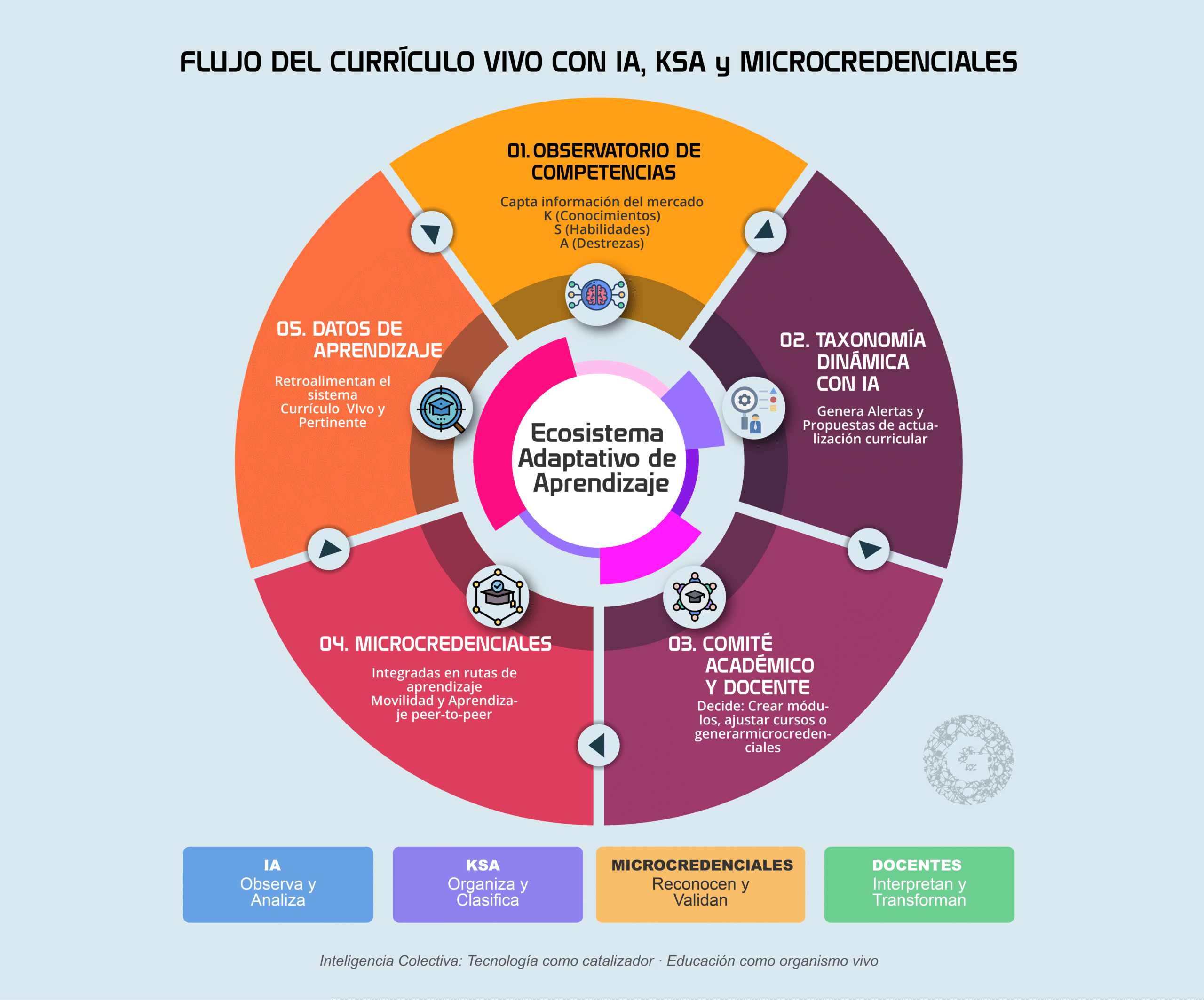 Flujo del currículo vivo con IA, KSA y microcredenciales