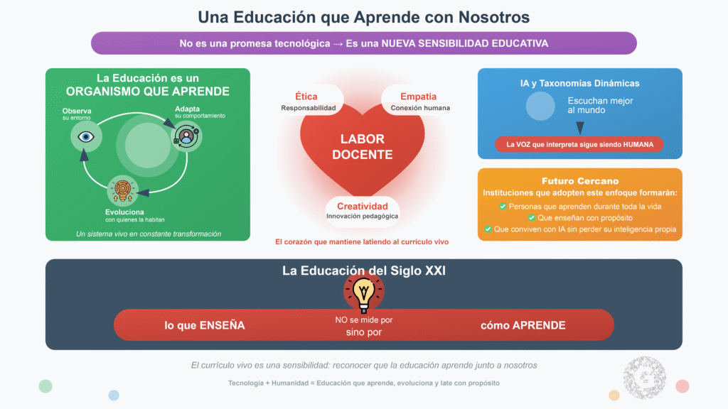 El currículo vivo no es una promesa tecnológica, sino una nueva sensibilidad educativa. Significa reconocer que la educación es un organismo que aprende: observa su entorno, adapta su comportamiento y evoluciona junto a quienes la habitan.