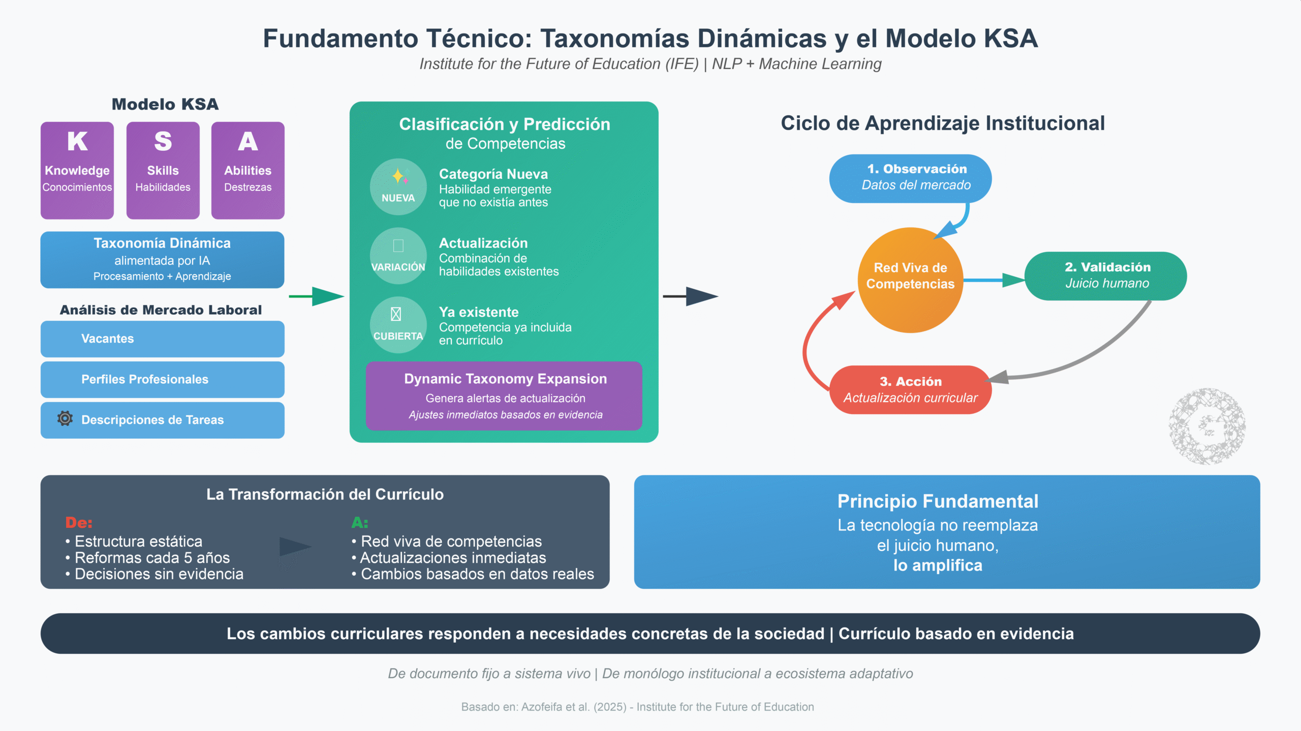 En la base de esta transformación se encuentra el modelo KSA, acrónimo de Knowledge, Skills, and Abilities (conocimientos, habilidades y destrezas). Este enfoque, originado en el ámbito laboral, ha sido revitalizado por la investigación reciente del Institute for the Future of Education (IFE), que propone una taxonomía dinámica KSA alimentada por inteligencia artificial (Azofeifa et al., 2025).