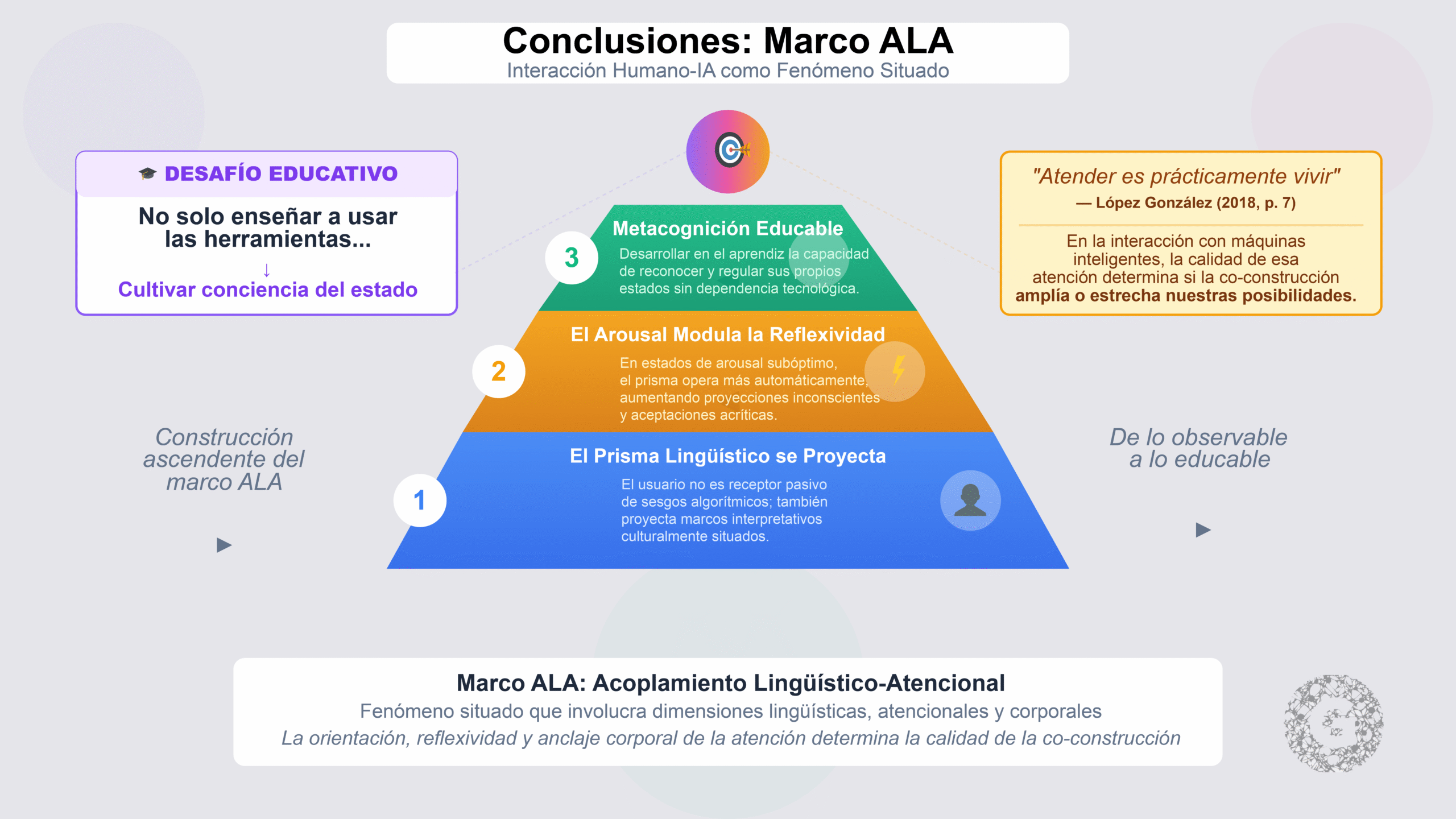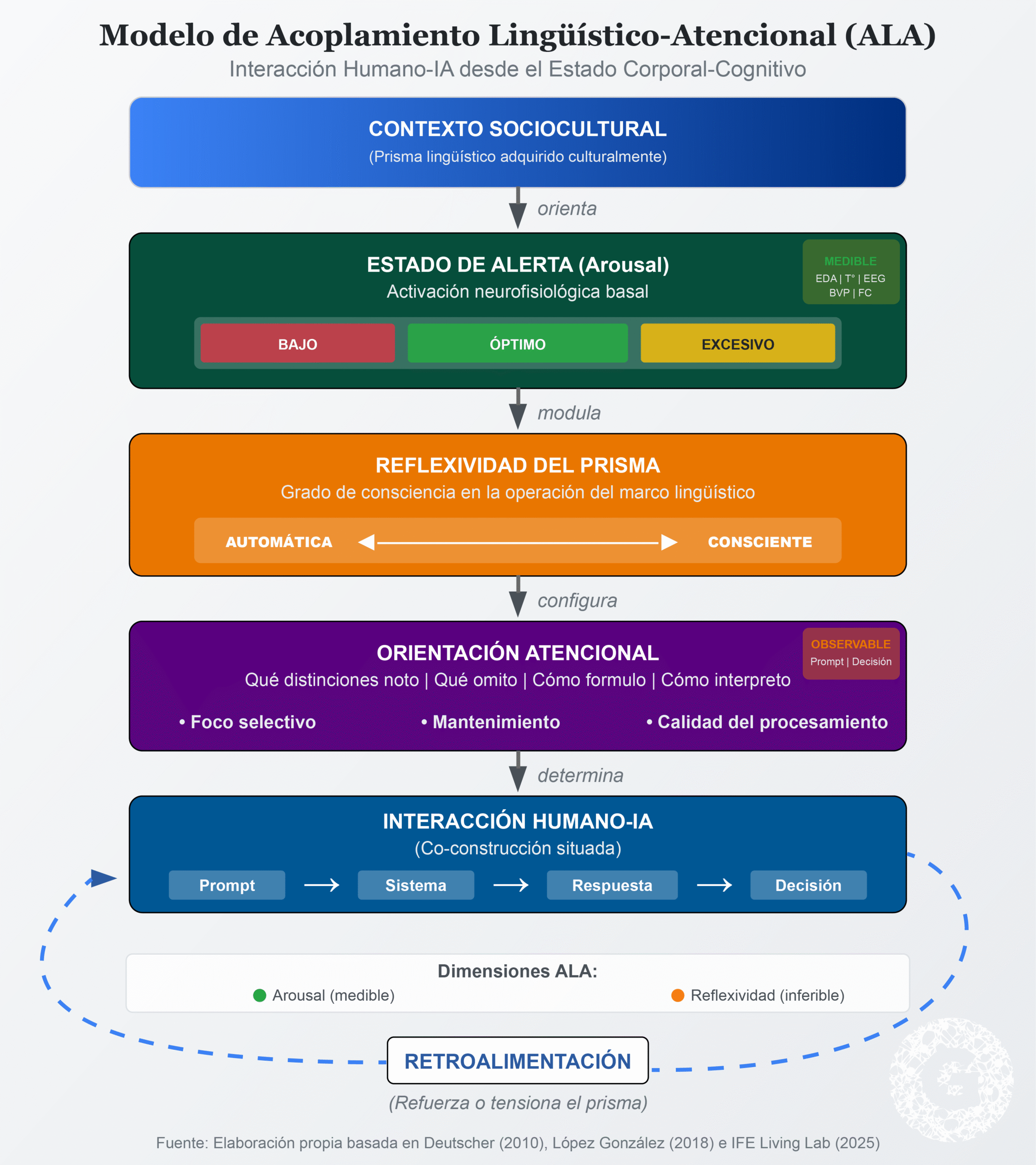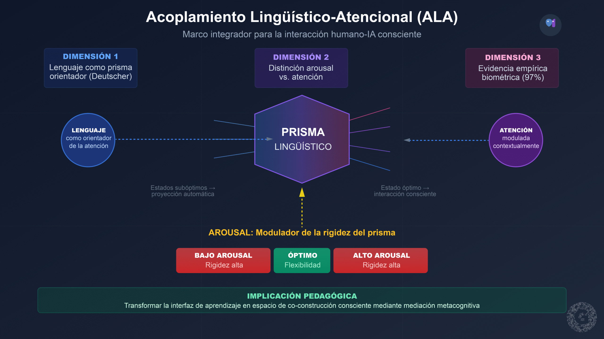 El concepto central que se propone es el de Acoplamiento Lingüístico-Atencional (ALA), definido como la relación dinámica entre el estado de arousal del usuario, la calidad de su orientación atencional, y el grado de reflexividad con que opera su prisma lingüístico durante la interacción con sistemas de IA. Se argumenta que este acoplamiento es medible, al menos parcialmente, y que su visibilización tiene implicaciones pedagógico-andragógicas que trascienden la mera alfabetización técnica.