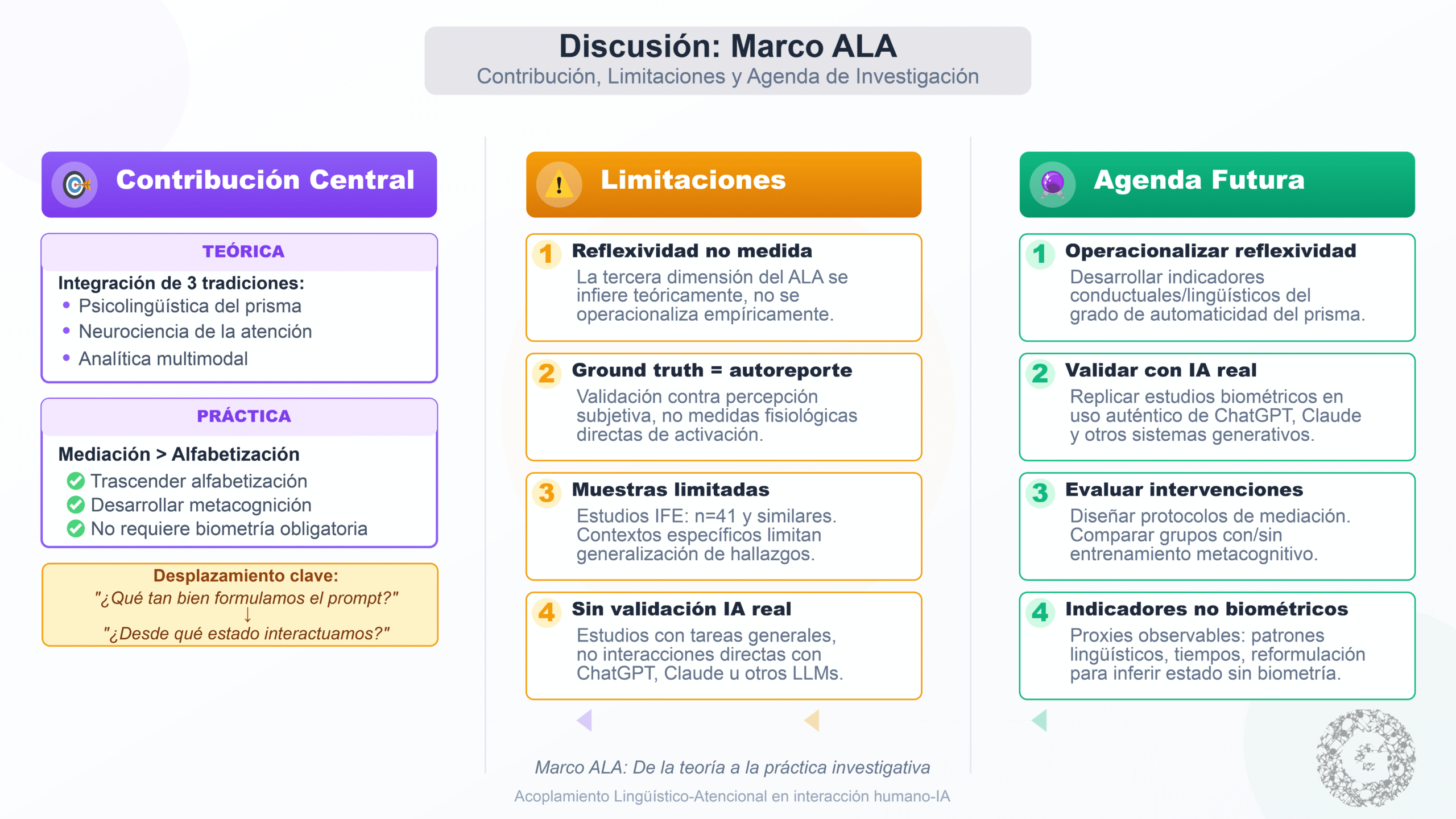 Teóricamente, el constructo ALA integra tradiciones habitualmente separadas: la psicolingüística del prisma cultural, la neurociencia de la atención, y la analítica multimodal del aprendizaje. Esta integración permite conceptualizar la interacción humano-IA como fenómeno situado, corporal y temporal, no solo técnico o semántico.