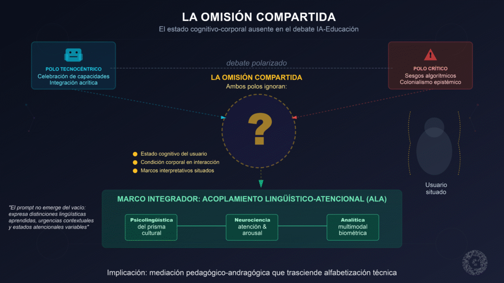 El debate contemporáneo sobre inteligencia artificial en educación ha oscilado entre dos polos. Por un lado, aproximaciones tecnocéntricas que celebran las capacidades de los sistemas y proponen su integración acrítica en los procesos formativos (Zawacki-Richter et al., 2019). Por otro, perspectivas críticas que denuncian sesgos algorítmicos, colonialismo epistémico y erosión de la agencia humana (Crawford, 2021; Noble, 2018). Ambas posturas, pese a sus diferencias, comparten una omisión significativa: el estado cognitivo y corporal desde el cual las personas interactúan con las máquinas.