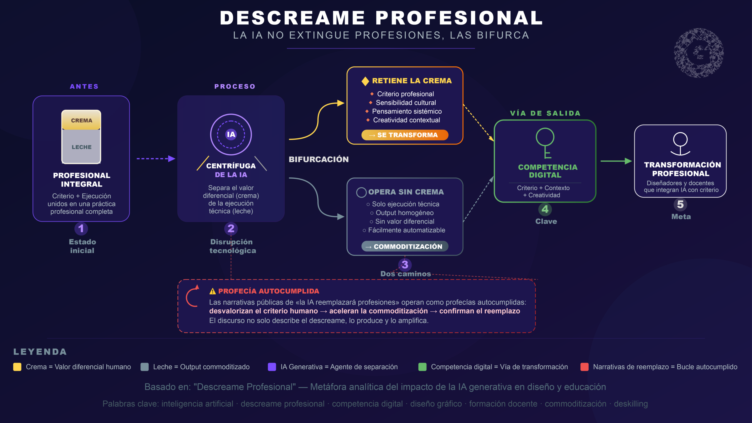 Este artículo propone el concepto de descreame profesional como metáfora analítica para comprender el impacto de la inteligencia artificial generativa en las profesiones del diseño y la educación. Así como la centrífuga separa la crema de la leche dejando un líquido homogéneo e indiferenciado, la IA está separando el valor diferencial de los profesionales —criterio, sensibilidad cultural, pensamiento sistémico— de la ejecución técnica, dejando un output commoditizado. Mediante una revisión de literatura que integra teoría del diseño, creatividad computacional, sociología del trabajo, marcos de competencia digital docente y datos de organismos internacionales, se demuestra que la IA no extingue profesiones sino que las bifurca: quienes retienen la “crema” (competencia profunda) se transforman; quienes operan sin ella se vuelven genéricos y reemplazables. El artículo concluye que la competencia digital —entendida no como habilidad operativa sino como integración de criterio, contexto y creatividad— constituye la vía de transformación profesional tanto para diseñadores como para docentes, y que las narrativas públicas de reemplazo operan como profecías autocumplidas que aceleran el descreame que pretenden describir.