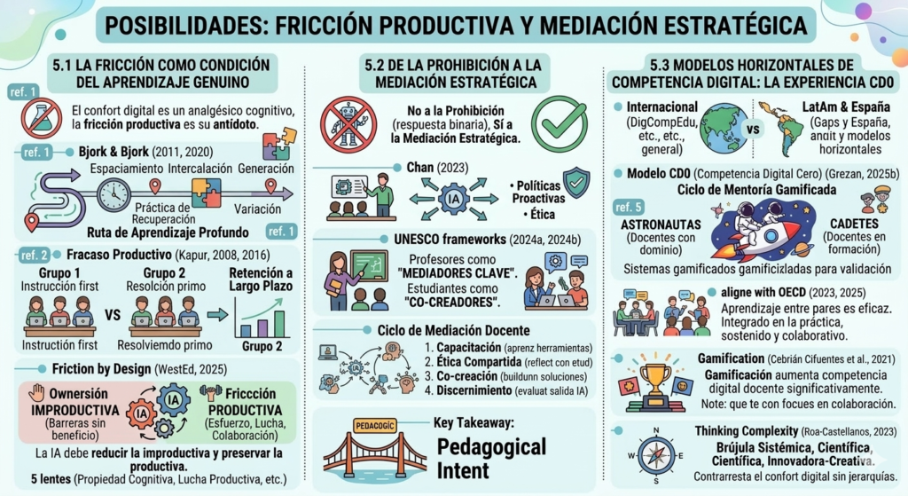 Frente a este diagnóstico, la respuesta no puede ser ni el luddismo tecnológico ni la adopción acrítica. La fricción productiva (Bjork y Bjork, 2020; Kapur, 2024; Sinha y Kapur, 2021; WestEd, 2025) ofrece un principio de diseño pedagógico que preserva la dificultad necesaria para el aprendizaje profundo mientras aprovecha las capacidades de la IA para reducir la fricción improductiva. Los modelos horizontales de competencia digital, como CD0, proporcionan estructuras sociales para esta mediación que no dependen de la lógica descendente —y potencialmente infantilizante— de la capacitación tradicional, sino de la autonomía heutagógica del aprendiz adulto.