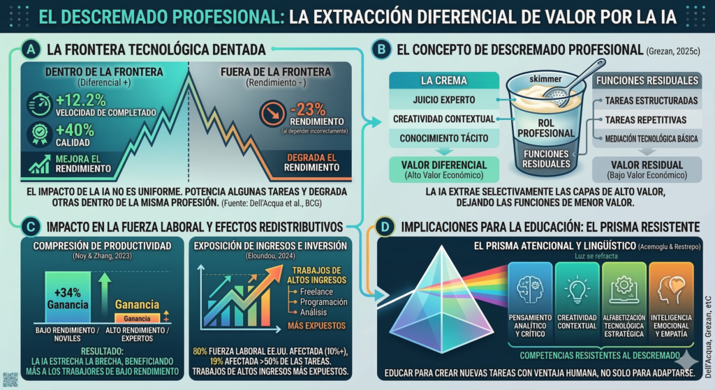 El concepto de descreame profesional (Grezan, 2025c) ofrece un marco para comprender este fenómeno desde la perspectiva educativa. Si la “crema” de una profesión representa el valor diferencial que el profesional aporta —aquel componente de su trabajo que requiere juicio experto, creatividad contextualizada y conocimiento tácito—, la IA opera un “descreame” selectivo: extrae progresivamente las capas de mayor valor económico pero menor resistencia a la automatización, dejando al profesional con las funciones residuales de menor valor.