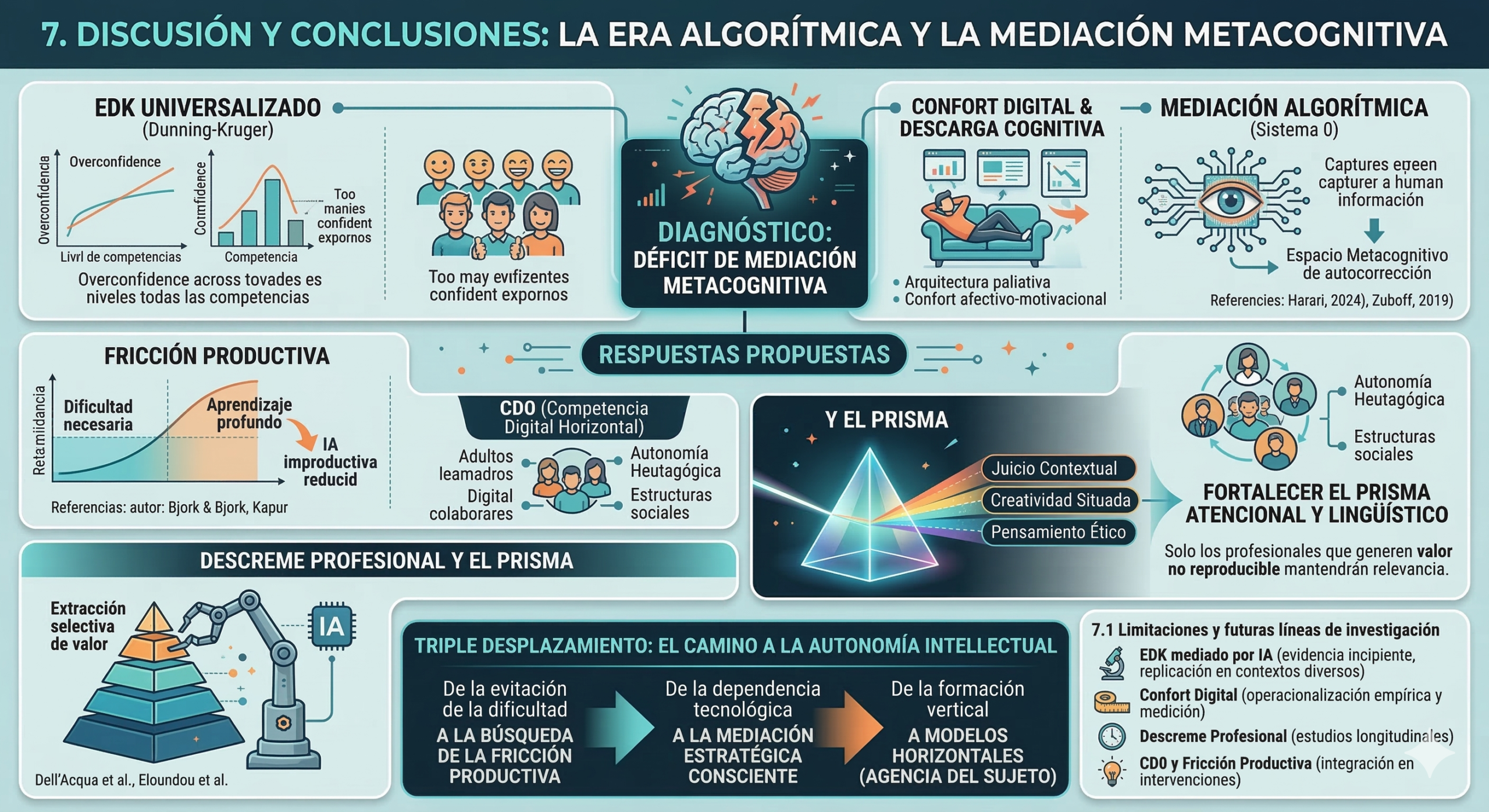 Este artículo presenta limitaciones inherentes a su naturaleza teórica-integradora. La evidencia sobre el EDK mediado por IA es aún incipiente y requiere replicación en contextos culturales diversos, particularmente latinoamericanos. El concepto de confort digital necesita operacionalización empírica que permita su medición y la evaluación de intervenciones. El descreame profesional, como marco analítico, demanda estudios longitudinales que documenten la evolución del valor diferencial en profesiones específicas tras la adopción masiva de IA generativa. Futuras investigaciones deberían examinar cómo los modelos horizontales como CD0 pueden integrarse con marcos de fricción productiva para diseñar intervenciones que fortalezcan el prisma atencional y lingüístico en contextos educativos formales e informales.