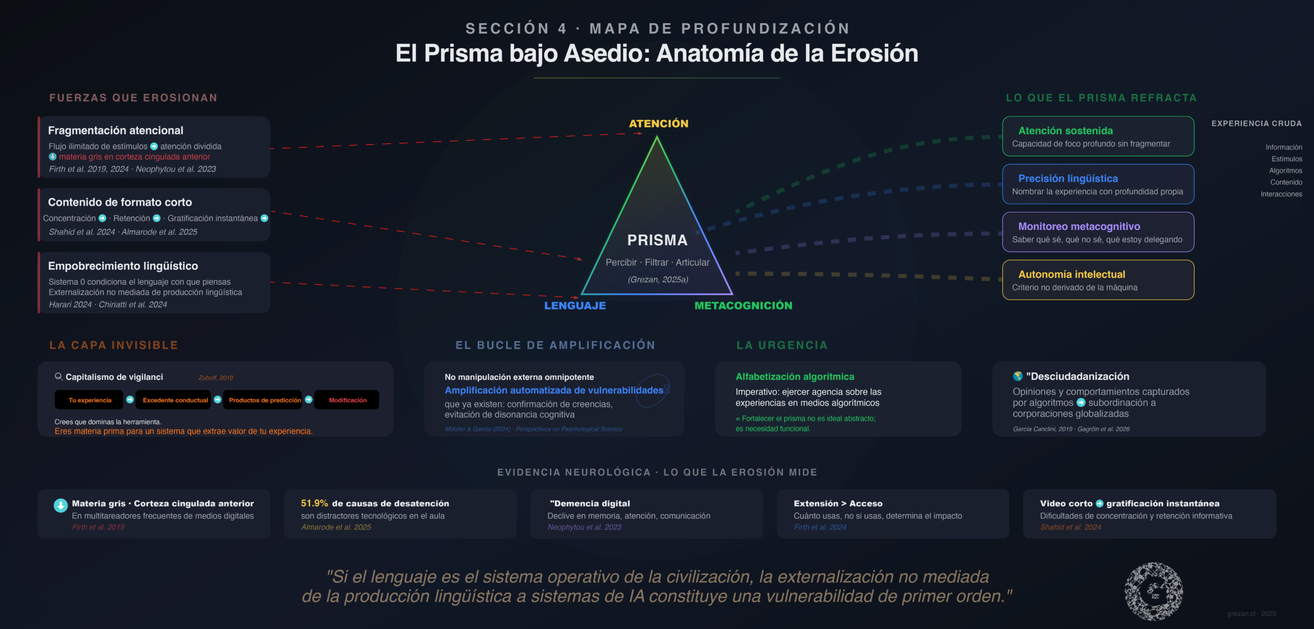 Sin embargo, la respuesta no puede ser el rechazo tecnológico. La verdadera pregunta no es si usar la IA, sino desde qué cuerpo, desde qué prisma atencional y lingüístico interactuamos con ella (Grezan, 2025a). Este artículo propone que la competencia fundamental de la era algorítmica reside en el fortalecimiento de ese prisma: la capacidad de percibir, filtrar y articular críticamente la experiencia antes, durante y después de la mediación tecnológica.