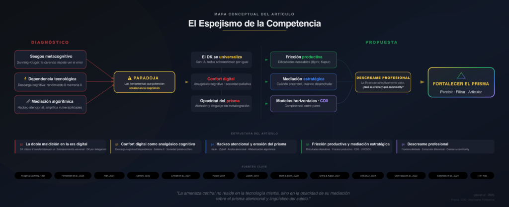La convergencia entre sesgos metacognitivos, dependencia tecnológica y mediación algorítmica configura un escenario educativo paradójico: las herramientas diseñadas para potenciar el aprendizaje pueden, simultáneamente, erosionar las capacidades cognitivas que pretenden desarrollar. El presente artículo analiza cómo el efecto Dunning-Kruger se transforma —sin desaparecer— en contextos mediados por inteligencia artificial, dando lugar a un estado de confort digital que funciona como analgésico cognitivo. Desde una perspectiva integradora que articula la neurociencia de la atención, la teoría de la mente extendida y los marcos de competencia digital, se argumenta que la amenaza central no reside en la tecnología misma, sino en la opacidad de su mediación sobre el prisma atencional y lingüístico del sujeto. Frente a este diagnóstico, se propone la fricción productiva y la mediación estratégica como ejes para recuperar la autonomía intelectual, y se discuten modelos horizontales de desarrollo de competencias digitales y la noción de descreame profesional como marcos para comprender el impacto diferencial de la IA en los perfiles laborales. El artículo concluye que el fortalecimiento del prisma —la capacidad de percibir, filtrar y articular la experiencia— constituye la competencia fundamental de la era algorítmica.