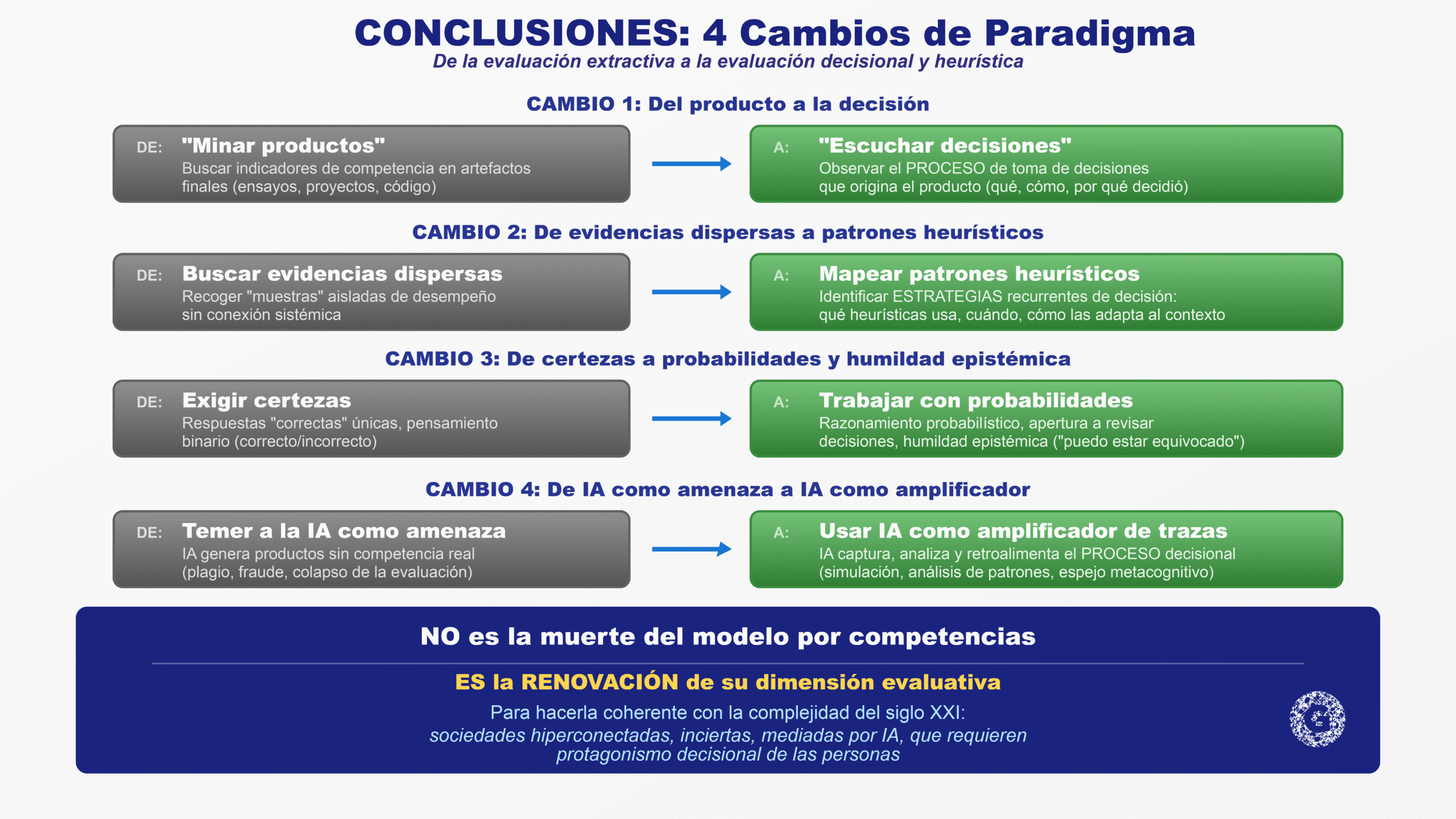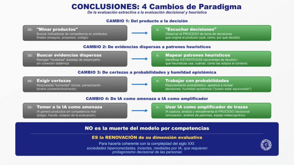 La transición desde un modelo extractivo hacia una evaluación decisional y heurística de competencias implica un cambio de paradigma: