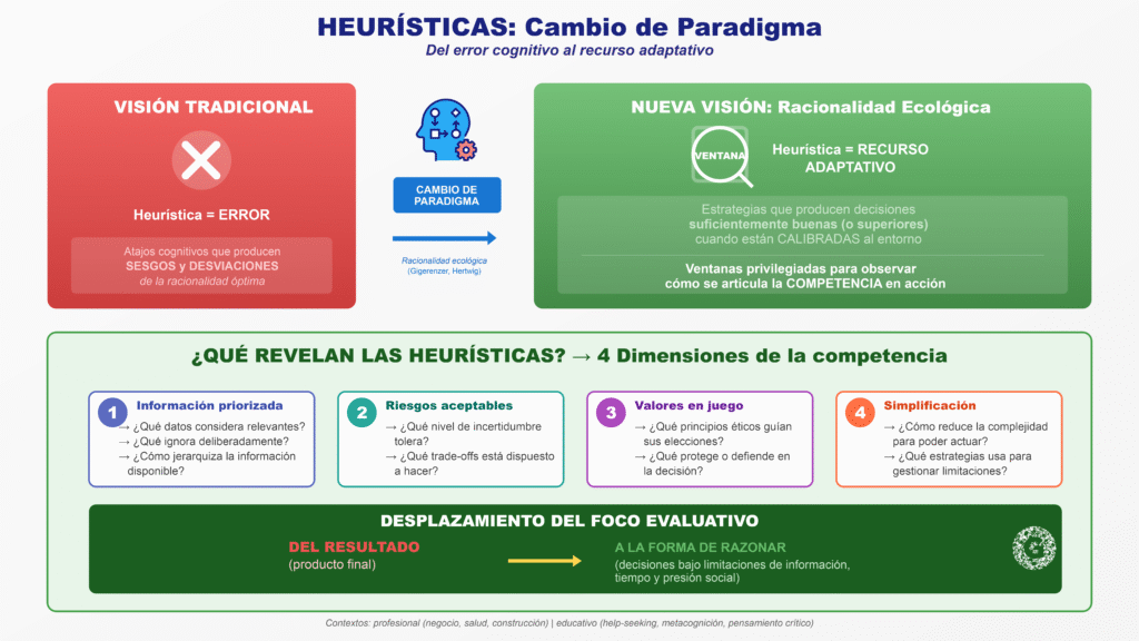 Desde esta perspectiva, las heurísticas no son simplemente “errores” a corregir, sino ventanas privilegiadas para observar cómo se articula la competencia en la acción: