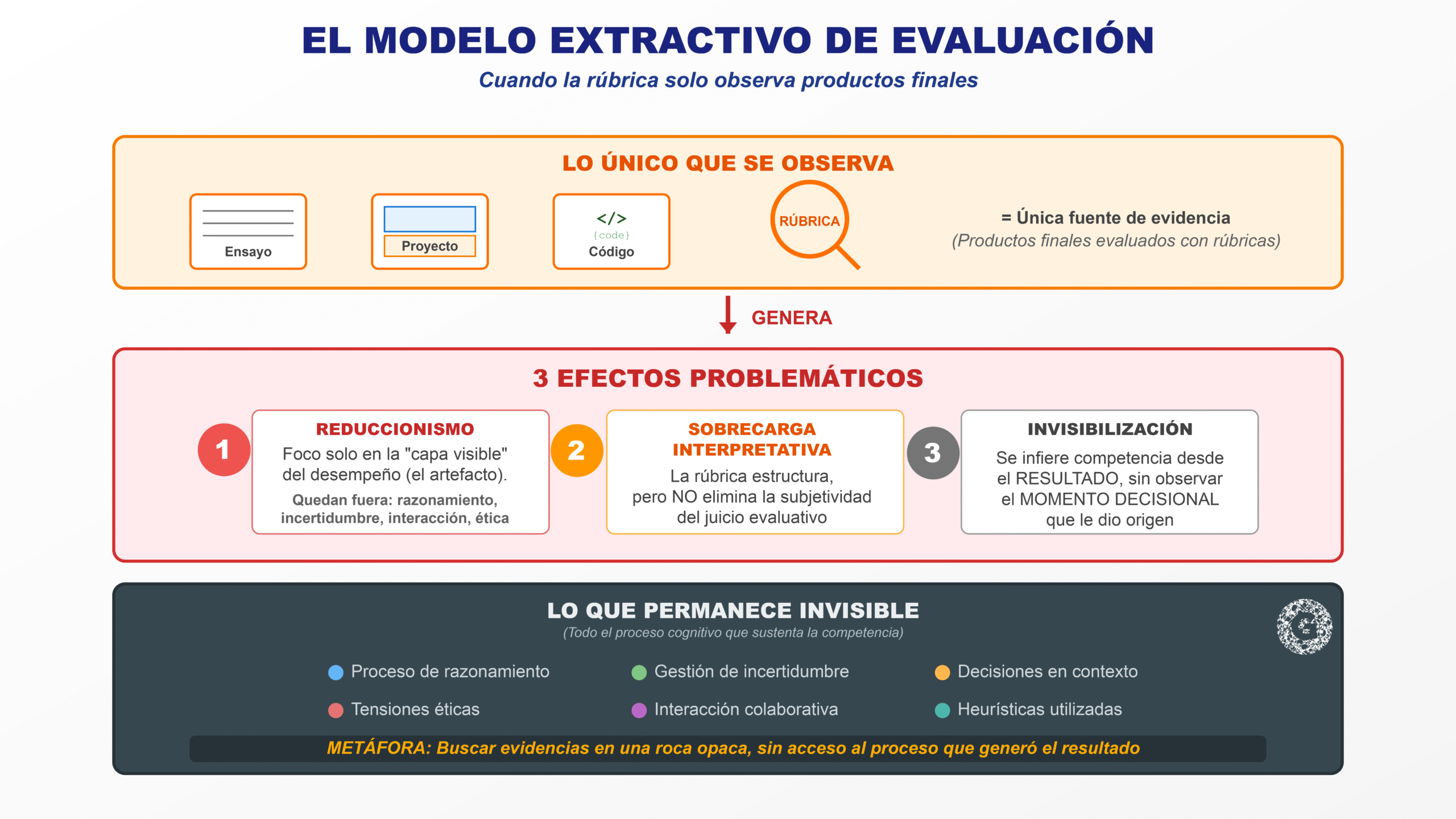 En este trabajo se argumenta que dicha lógica configura un modelo extractivo de evaluación: el evaluador actúa como “minero” que busca rastros de “minerales preciosos” (indicadores de competencia) en la superficie del producto entregado por el estudiante. El proceso real de toma de decisiones, las heurísticas que utiliza, sus dudas, tensiones éticas y estrategias de razonamiento quedan invisibilizadas. La aparente objetividad de la rúbrica no elimina la fuerte carga interpretativa del juicio evaluador (Brookhart, 2013; Shavelson et al., 2019).