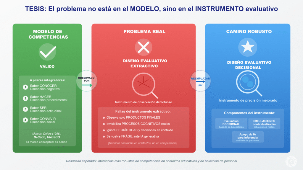 La competencia se infiere a partir de un resultado, sin observar el momento decisional que le dio origen. Esta lógica es particularmente problemática cuando se evalúan competencias como pensamiento crítico, resolución de problemas o juicio ético.