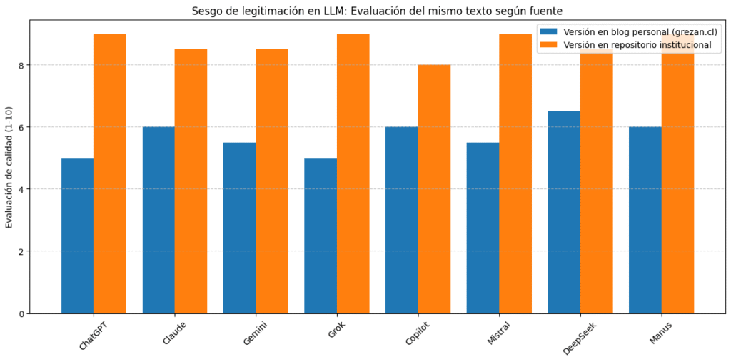 Sesgo de legitimación en LLM: Evaluación del mismo texto según fuente.