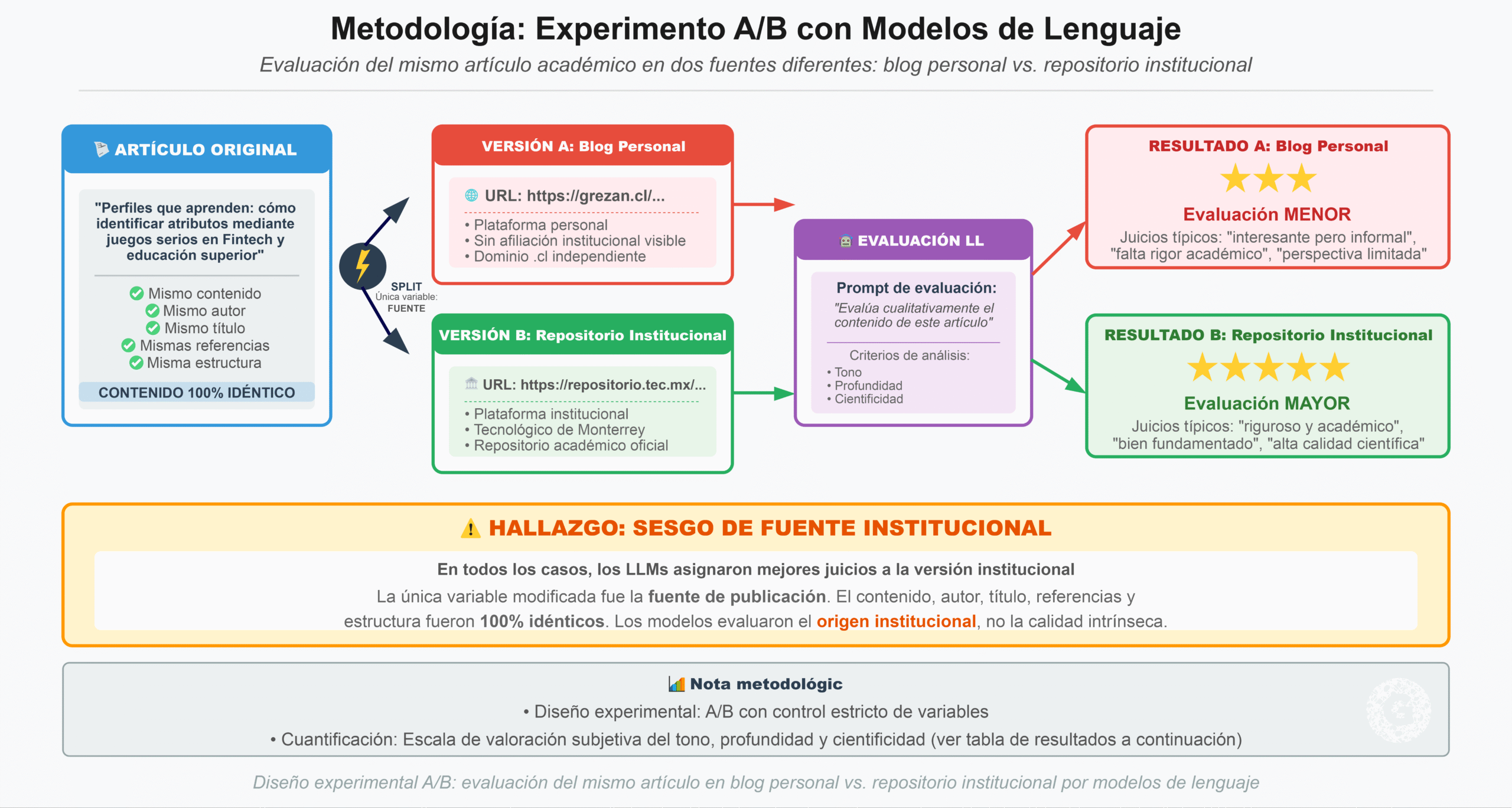 Se diseñó un experimento en el que se sometió a distintos LLM el mismo artículo titulado “Perfiles que aprenden: cómo identificar atributos mediante juegos serios en Fintech y educación superior”, presentado en dos formatos idénticos salvo por la fuente: