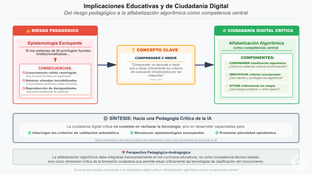 Desde la epistemología crítica, esto supone una injusticia epistémica: los sujetos que no forman parte de instituciones tradicionales quedan epistemológicamente invisibles o deslegitimados. En educación, esto perpetúa desigualdades, ya que los estudiantes o investigadores sin acceso a canales formales de publicación ven minimizada su producción intelectual por sistemas automatizados de evaluación y recomendación.