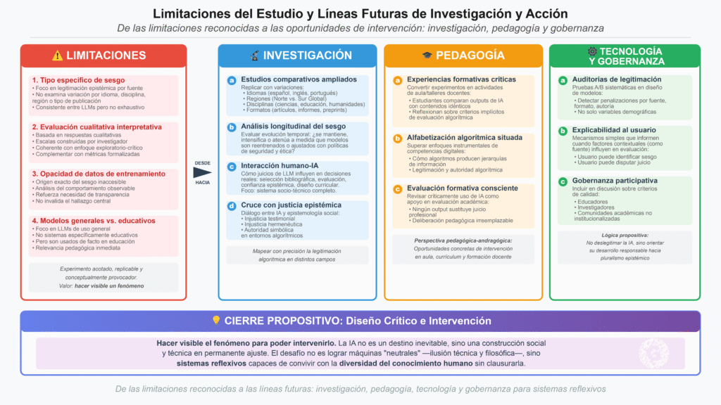 Este estudio se concibió deliberadamente como un experimento acotado, replicable y conceptualmente provocador. Su valor no reside en la generalización estadística, sino en la capacidad de hacer visible un fenómeno estructural que suele permanecer oculto tras la aparente neutralidad de los sistemas de inteligencia artificial. No obstante, reconocer sus limitaciones es una condición necesaria para avanzar hacia propuestas más robustas, tanto en investigación como en diseño pedagógico y tecnológico.