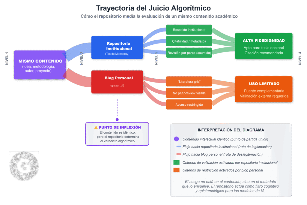 El repositorio actúa como mediador epistemológico, activando criterios de legitimidad académica que conducen a veredictos distintos, aun cuando el contenido permanece inalterado.