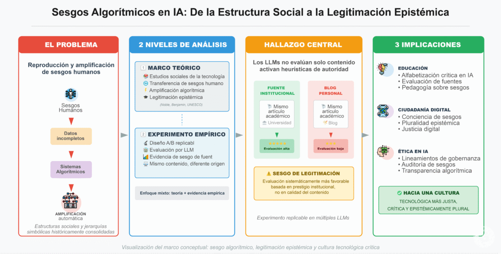 Este artículo articula dos niveles de análisis. En primer lugar, desarrolla un marco teórico desde los estudios sociales de la tecnología que explica cómo los sesgos humanos se transfieren a los sistemas algorítmicos y son amplificados mediante procesos automatizados. En segundo lugar, presenta un experimento empírico replicable que evidencia un sesgo algorítmico de legitimación epistémica en modelos de lenguaje de gran escala (LLM). A través de un diseño A/B, se demuestra que distintos LLM evalúan de manera sistemáticamente más favorable un mismo artículo académico cuando este proviene de una fuente institucional, en comparación con su publicación idéntica en un blog personal.