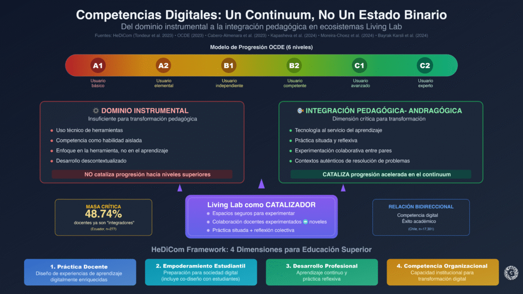 El desarrollo de competencias digitales en entornos Living Lab se beneficia de marcos conceptuales robustos que orientan tanto el diseño de experiencias como su evaluación. El Higher Education Digital Competence Framework (HeDiCom), desarrollado y validado por Tondeur et al. (2023), propone cuatro dimensiones específicas para educación superior: práctica docente, empoderamiento de estudiantes para la sociedad digital, desarrollo profesional propio, y competencia digital organizacional. Significativamente, este marco enfatiza el potencial de incluir a los estudiantes en los procesos de diseño, lo que converge directamente con los principios de co-creación propios de los Living Labs.