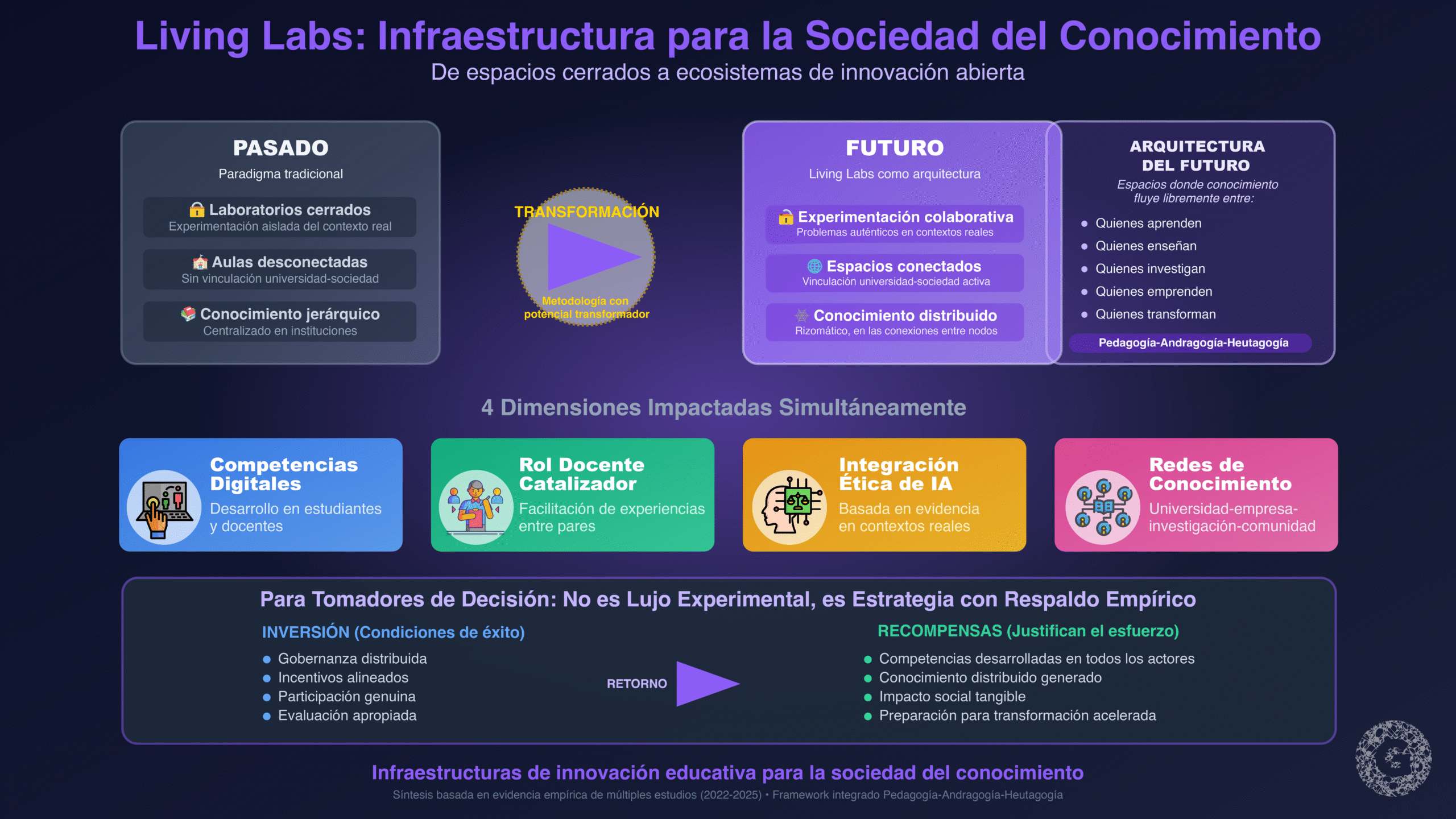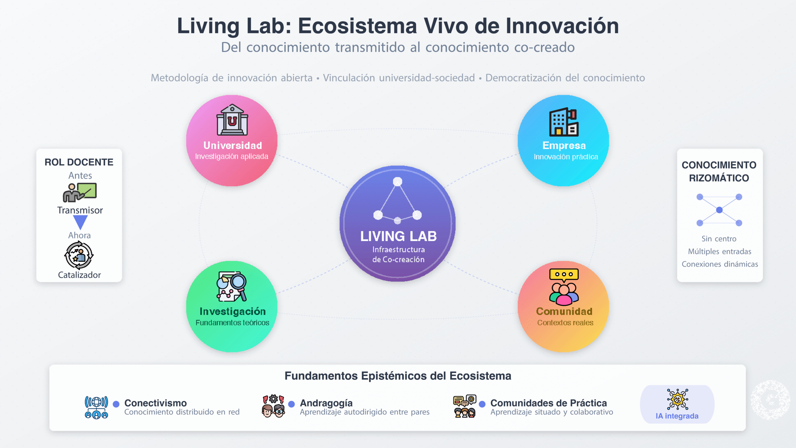 Desde una perspectiva de Pedagogía-Andragogía, los Living Labs operacionalizan principios de aprendizaje adulto —autodirección, experiencia como recurso, orientación a problemas, motivación intrínseca— en entornos que simultáneamente desarrollan capacidades heutagógicas de autodeterminación. El conocimiento emergente en estos espacios es genuinamente distribuido y rizomático: no reside en individuos o instituciones aisladas sino en las conexiones entre nodos diversos que colaboran en la resolución de problemas auténticos.