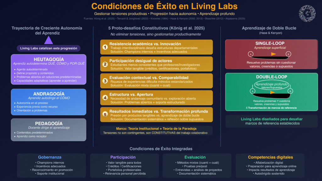 Desde una perspectiva andragógica (Knowles, 1984) y heutagógica (Hase & Kenyon, 2000, 2013), la participación se sostiene cuando los aprendices perciben relevancia personal, ejercen control sobre su proceso, y desarrollan no solo competencias sino capacidades adaptativas. El concepto de “aprendizaje de doble bucle” (double-loop learning) de Hase y Kenyon —que cuestiona valores, creencias y supuestos, no solo resuelve problemas— caracteriza el tipo de aprendizaje profundo que los Living Labs pueden facilitar cuando se diseñan para desafiar marcos de referencia establecidos.