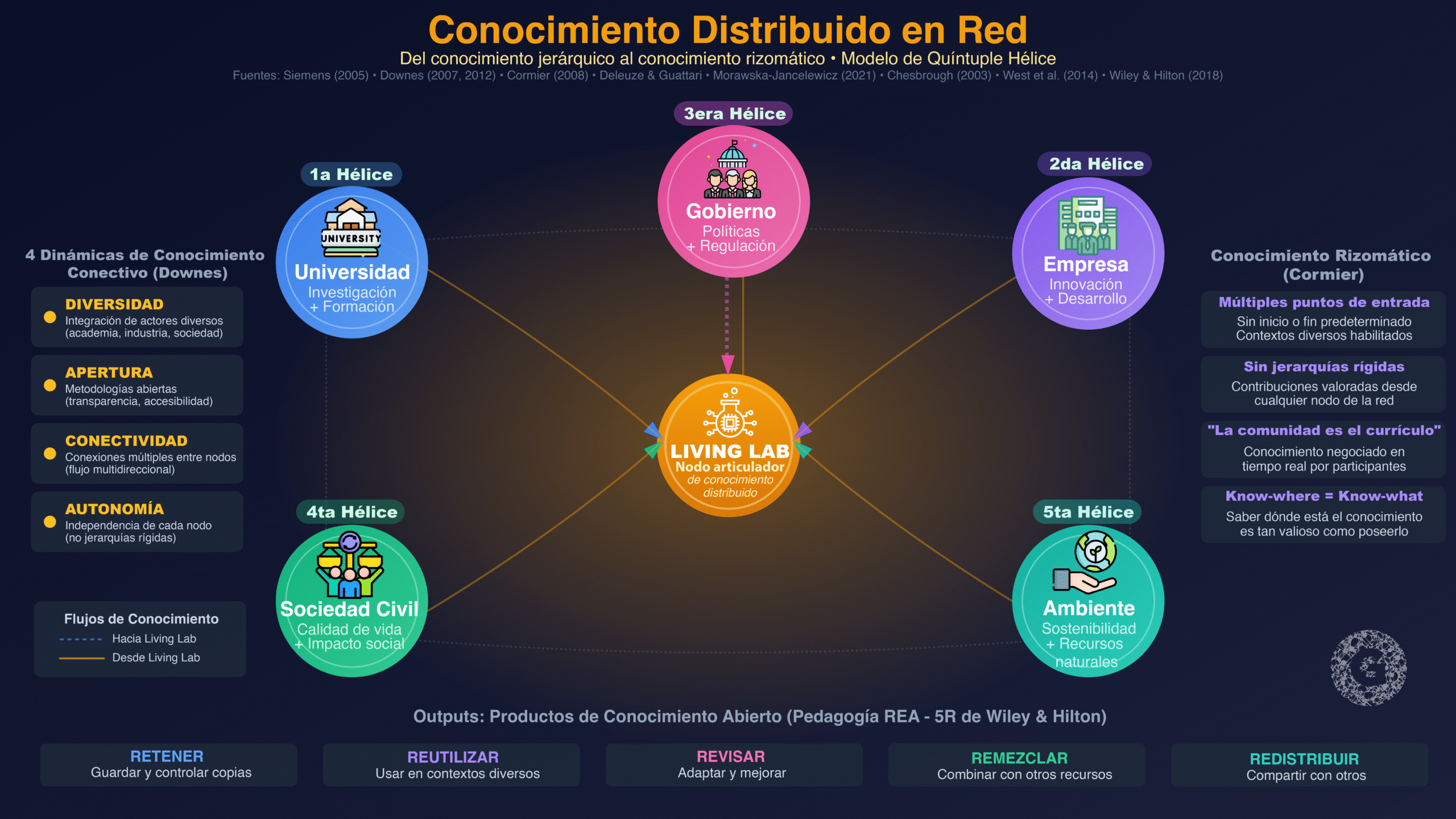 Downes (2007, 2012) profundizó esta visión introduciendo el concepto de “conocimiento conectivo” como tercer tipo junto al cualitativo y cuantitativo. Cuatro dinámicas incrementan la probabilidad de que las redes produzcan nuevo conocimiento conectivo: diversidad, apertura, conectividad y autonomía de los nodos. Los Living Labs bien diseñados exhiben estas cuatro propiedades: integran actores diversos, operan con metodologías abiertas, facilitan conexiones múltiples y respetan la autonomía de cada participante.