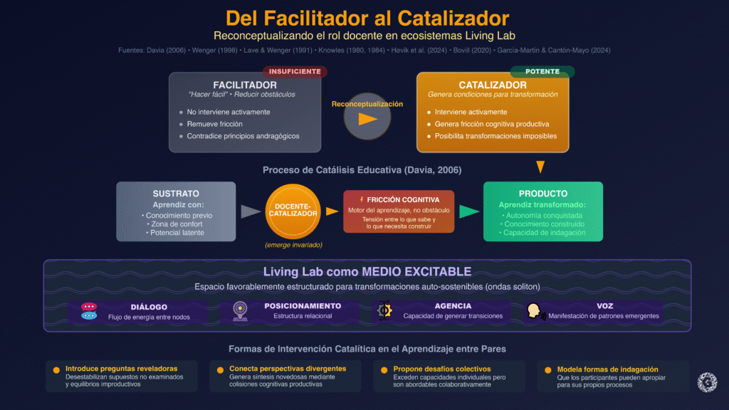 El docente-catalizador en un Living Lab interviene de múltiples formas: introduce preguntas que revelan supuestos no examinados, conecta participantes cuyas perspectivas divergentes pueden generar síntesis novedosas, propone desafíos que exceden las capacidades individuales pero son abordables colectivamente, y modela formas de indagación que los participantes pueden apropiar. Bovill (2020) argumenta a favor de enfoques de co-creación que involucren a toda la clase; el docente-catalizador hace esto posible al intervenir activamente para que voces marginales emerjan y perspectivas dominantes sean cuestionadas.