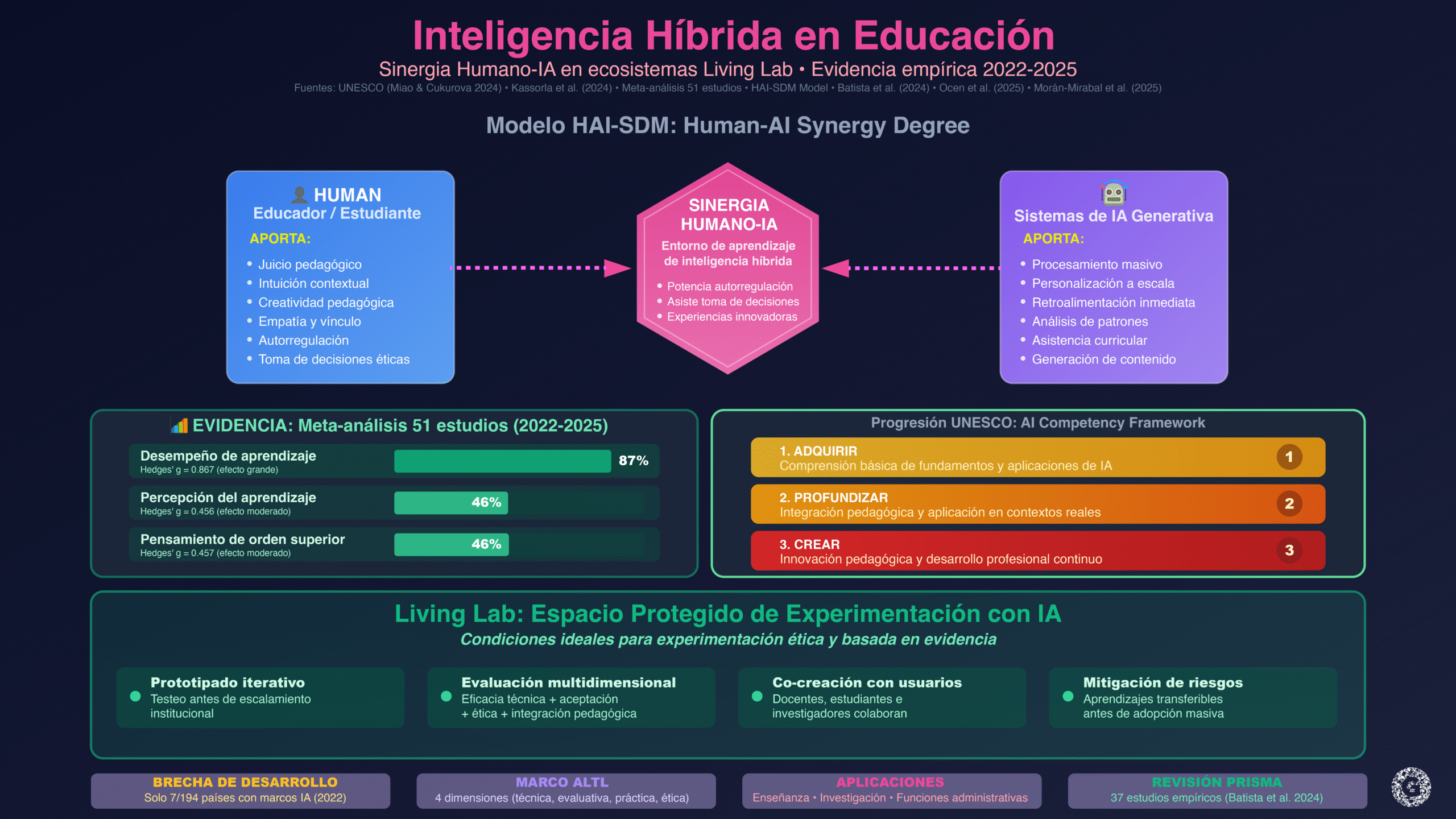 El modelo Human-AI Synergy Degree (HAI-SDM), propuesto en Humanities and Social Sciences Communications (2025), conceptualiza la colaboración humano-IA en entornos de aprendizaje híbrido. Los hallazgos indican que la IA potencia el aprendizaje autorregulado de los estudiantes y asiste en la gestión curricular y toma de decisiones informada. La integración crea lo que los autores denominan “entornos de aprendizaje de inteligencia híbrida”, concepto que resuena con la visión de Living Labs como espacios donde múltiples formas de inteligencia —humana y artificial— colaboran en la producción de conocimiento.
