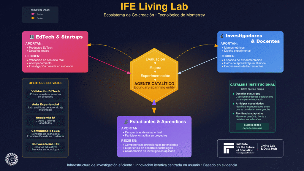 El IFE Living Lab del Tecnológico de Monterrey ejemplifica esta aplicación metodológica. Como documentan Morán-Mirabal et al. (2025), este laboratorio viviente se enfoca en tres funciones centrales: evaluación, experimentación y mejora de tecnologías educativas mediante co-creación. El ecosistema articula empresas EdTech y startups, investigadores, docentes y estudiantes en un espacio de innovación basado en evidencia que simultaneamente desarrolla competencias académicas y profesionales, genera conocimiento de innovación educativa transferible, y configura entornos de enseñanza-aprendizaje experiencial enriquecidos.