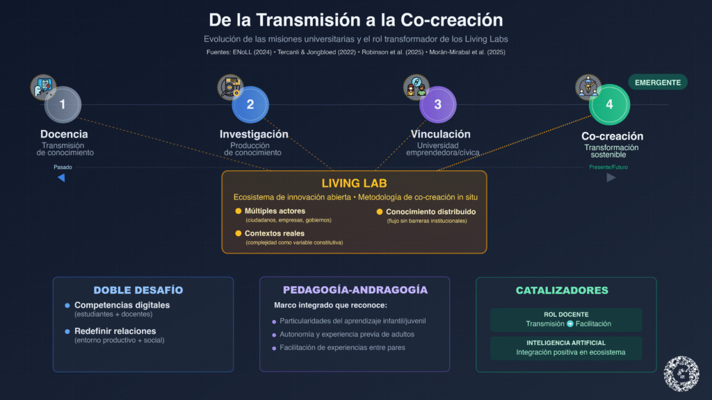La transición desde el rol de transmisor hacia el de catalizador constituye en sí misma un proceso de aprendizaje profesional que los Living Labs pueden sostener. García-Martín y Cantón-Mayo (2024) validan los principios andragógicos de “necesidad de saber” y “rol de la experiencia” en programas de desarrollo docente, encontrando diferencias significativas basadas en experiencia laboral previa. Esto sugiere que los docentes desarrollan competencias catalíticas precisamente cuando experimentan los efectos de sus intervenciones en contextos auténticos.