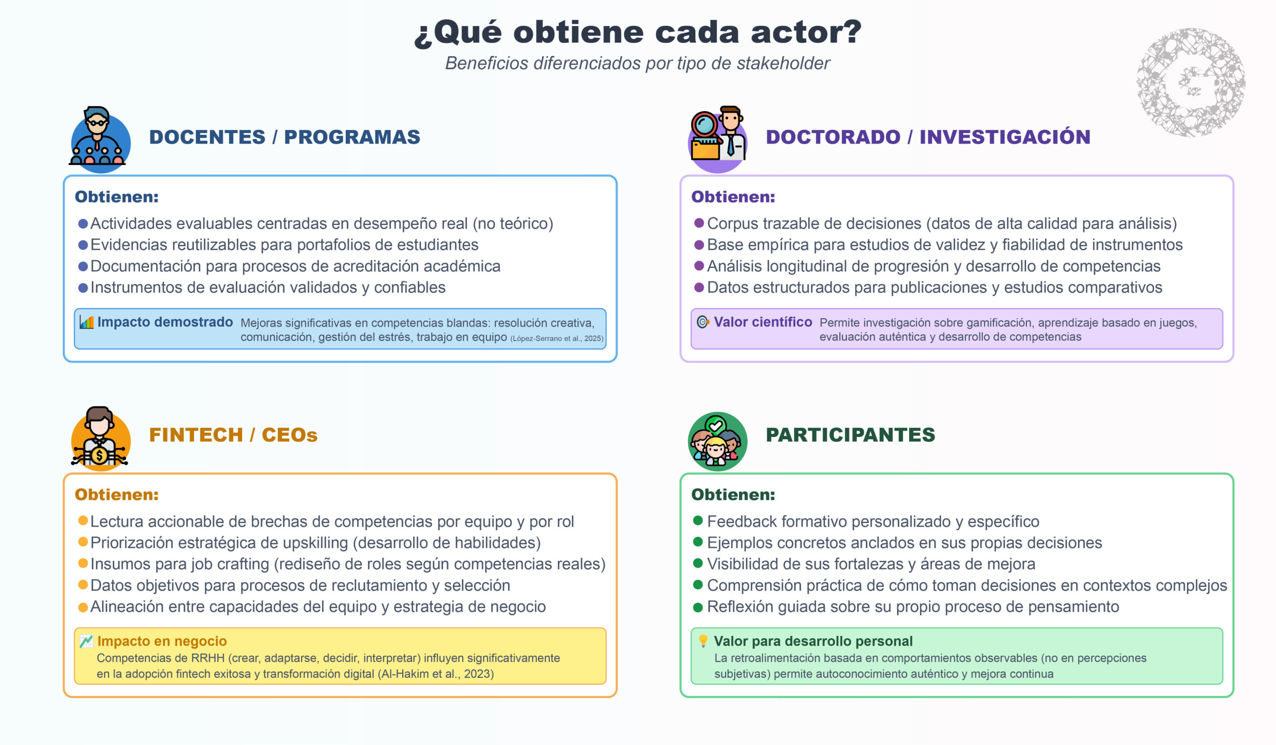 Docentes/Programas: actividades evaluables centradas en desempeño real, evidencias reutilizables para portafolios y acreditación. Los juegos serios validados han demostrado mejoras estadísticamente significativas en competencias blandas incluyendo resolución creativa de problemas, comunicación efectiva, gestión del estrés y trabajo en equipo (López-Serrano et al., 2025).