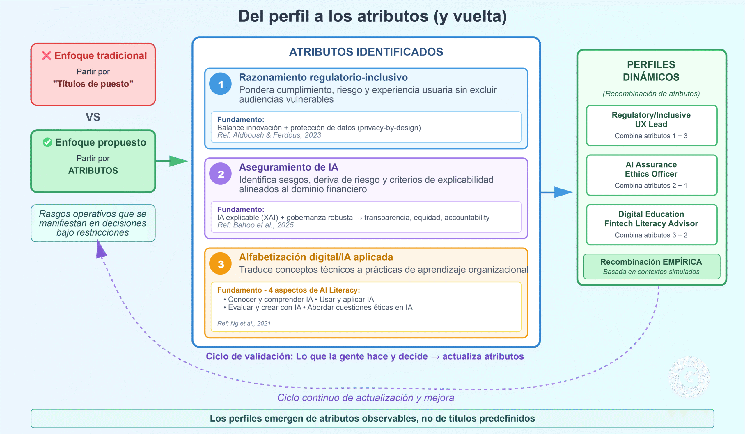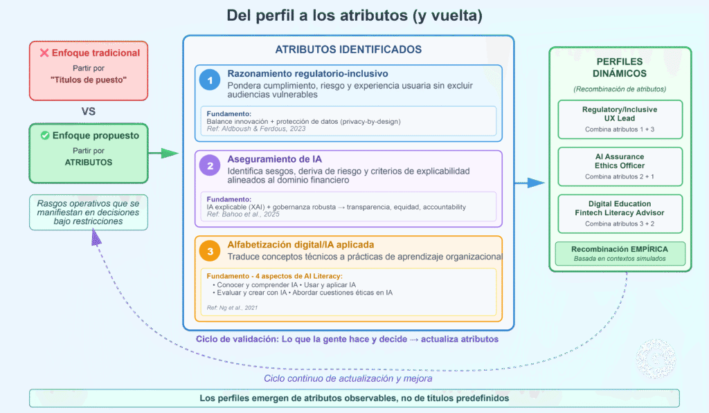 Luego, los atributos se recombinan en perfiles dinámicos (p. ej., Regulatory/Inclusive UX Lead, AI Assurance & Ethics Officer, Digital Education & Fintech Literacy Advisor). Esta recombinación es empírica: depende de lo que la gente hace y decide en contextos simulados.