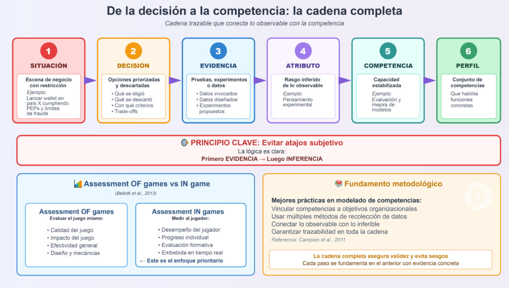 La lógica evita atajos subjetivos: primero evidencia, luego inferencia. Este enfoque es consistente con la distinción establecida por Bellotti et al. (2013) entre assessment OF games (evaluar calidad e impacto) y assessment IN games (medir desempeño y progreso del jugador), priorizando la evaluación formativa embebida en tiempo real.