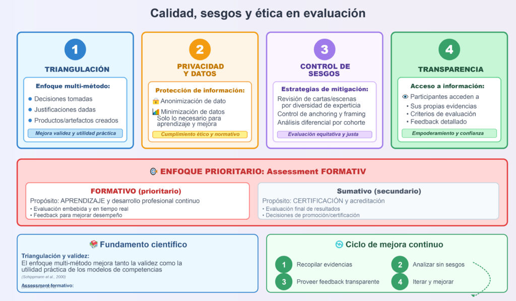 Sesgos: revisión de cartas/escenas por diversidad de experticia y contexto; control de anchoring y framing; análisis diferencial por cohorte.