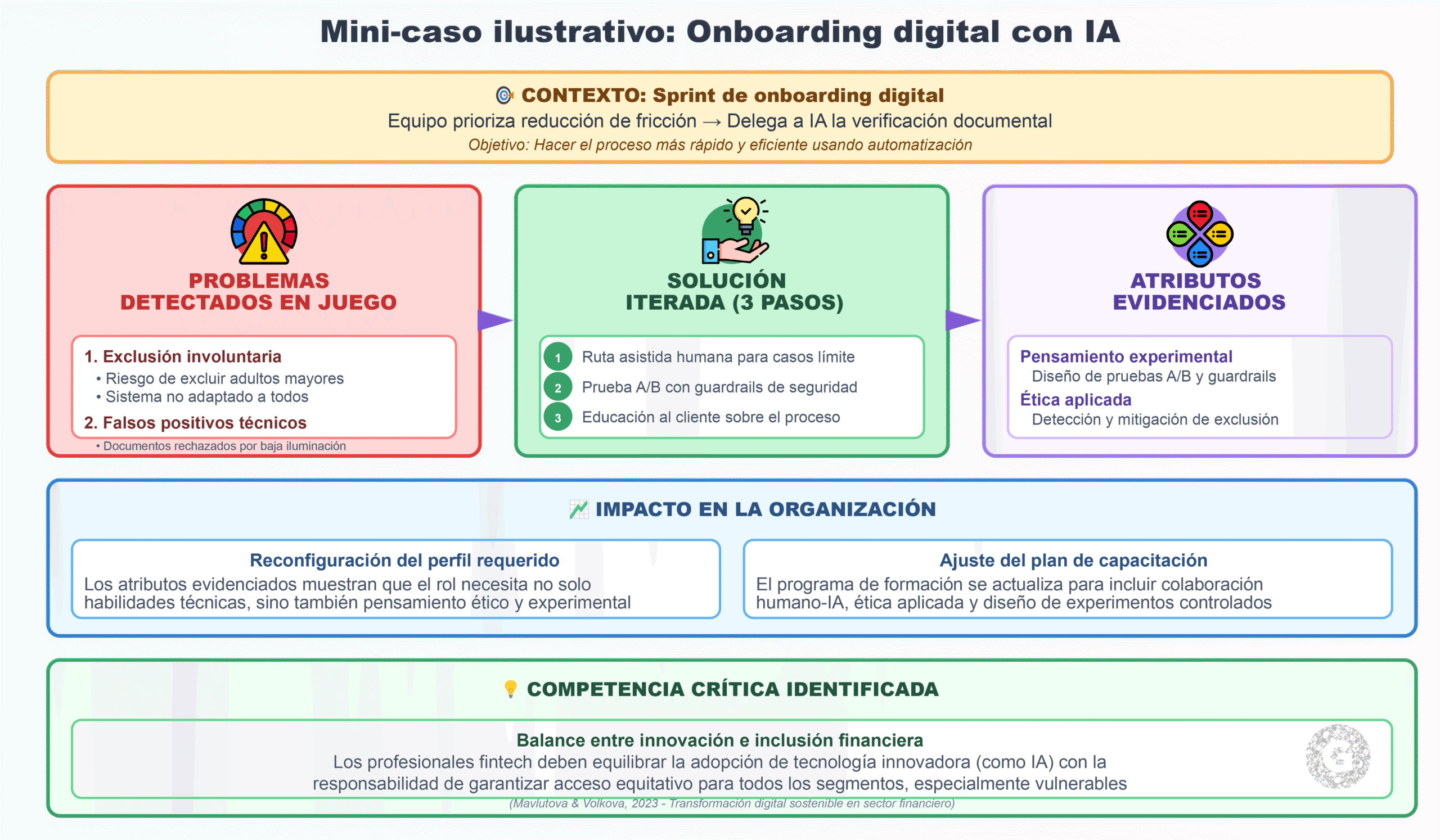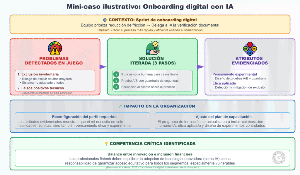 En un sprint de onboarding digital, un equipo prioriza reducción de fricción y delega a IA la verificación documental. En juego detectan: riesgo de exclusión de adultos mayores y falsos positivos por baja iluminación. La solución iterada incluye: (1) ruta asistida humana para casos límite, (2) prueba A/B con guardrails y (3) educación al cliente.