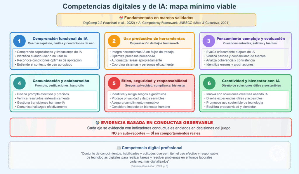 Para describir lo observado en términos accionables, usamos un mapa mínimo viable de competencias digitales/IA en 6 ejes, fundamentado en marcos validados como DigComp 2.2 (Vuorikari et al., 2022) y el AI Competency Framework de UNESCO (Miao & Cukurova, 2024):