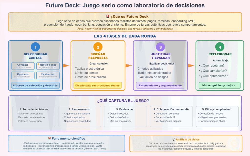 Future Deck es un juego serio de cartas que provoca escenarios realistas (pagos, remesas, onboarding KYC, prevención de fraude, open banking, educación al cliente, etc.). La literatura científica sobre juegos serios demuestra que pueden proporcionar soluciones viables a las limitaciones de las evaluaciones de desempeño tradicionales, ofreciendo entornos de tareas auténticas que provocan comportamientos relacionados con niveles de habilidad de candidatos (Burr et al., 2024).