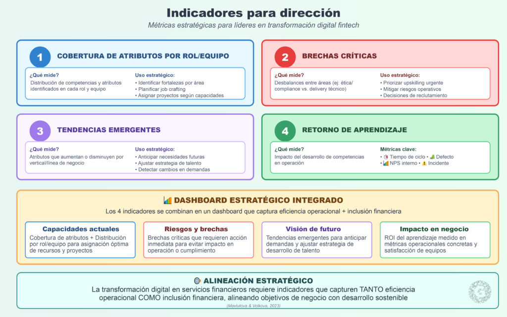 Fintech/CEOs: lectura accionable de brechas por equipo/rol; priorización de upskilling y job crafting; insumos para reclutamiento. La investigación empírica demuestra que las competencias de recursos humanos específicas (crear, adaptarse al cambio, decidir iniciar acción, interpretar análisis) influyen significativamente en la adopción fintech exitosa (Al-Hakim et al., 2023).