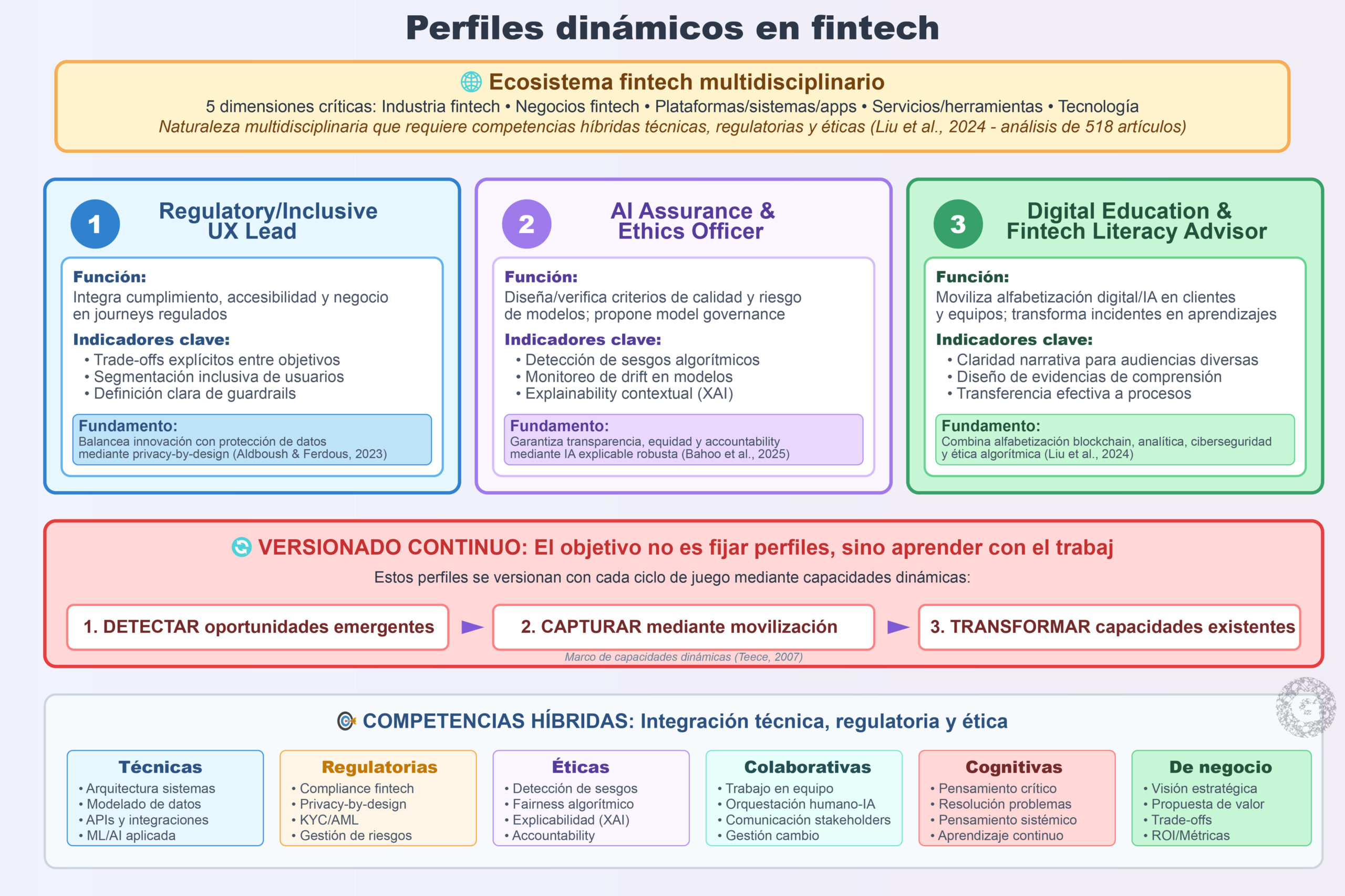 El ecosistema fintech contemporáneo requiere perfiles profesionales que integren competencias técnicas, regulatorias y éticas de manera híbrida. Un estudio de mapeo sistemático de 518 artículos fintech identifica cinco dimensiones críticas del ecosistema: industria fintech, negocios fintech, plataformas/sistemas/apps, servicios/herramientas y tecnología, evidenciando la naturaleza multidisciplinaria que requiere competencias híbridas (Liu et al., 2024). Los perfiles emergentes identificados en nuestro estudio incluyen: