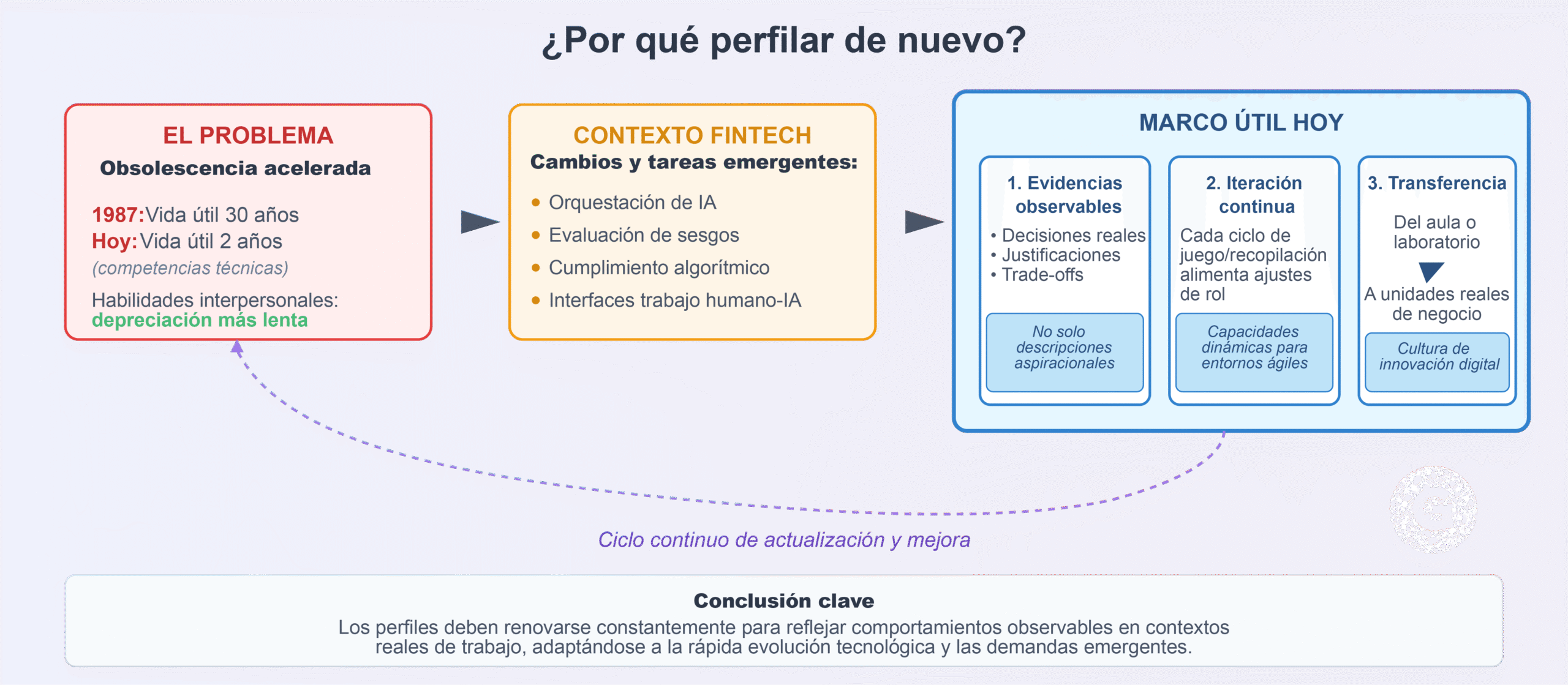 Los catálogos de perfiles envejecen rápido. La investigación reciente sobre obsolescencia de habilidades demuestra que la vida útil de las competencias técnicas ha caído dramáticamente de 30 años en 1987 a aproximadamente 2 años en la actualidad, mientras que las habilidades interpersonales muestran una depreciación considerablemente más lenta (Schultheiss & Backes-Gellner, 2023). En el contexto específico de fintech, cambian las funciones, surgen tareas emergentes —por ejemplo, orquestación de IA, evaluación de sesgos, cumplimiento algorítmico— y se reconfiguran las interfaces de trabajo humano–IA (Bahoo et al., 2025). Un marco de perfiles útil hoy necesita: