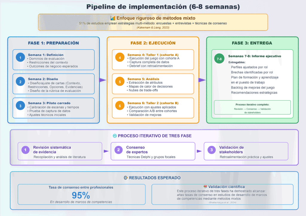 Este proceso iterativo de tres fases (revisión sistemática de evidencia, consenso de expertos y validación de stakeholders) ha demostrado alcanzar tasas de consenso del 95% entre profesionales en estudios de desarrollo de marcos de competencias mediante métodos mixtos (Bhattacharjya et al., 2024).