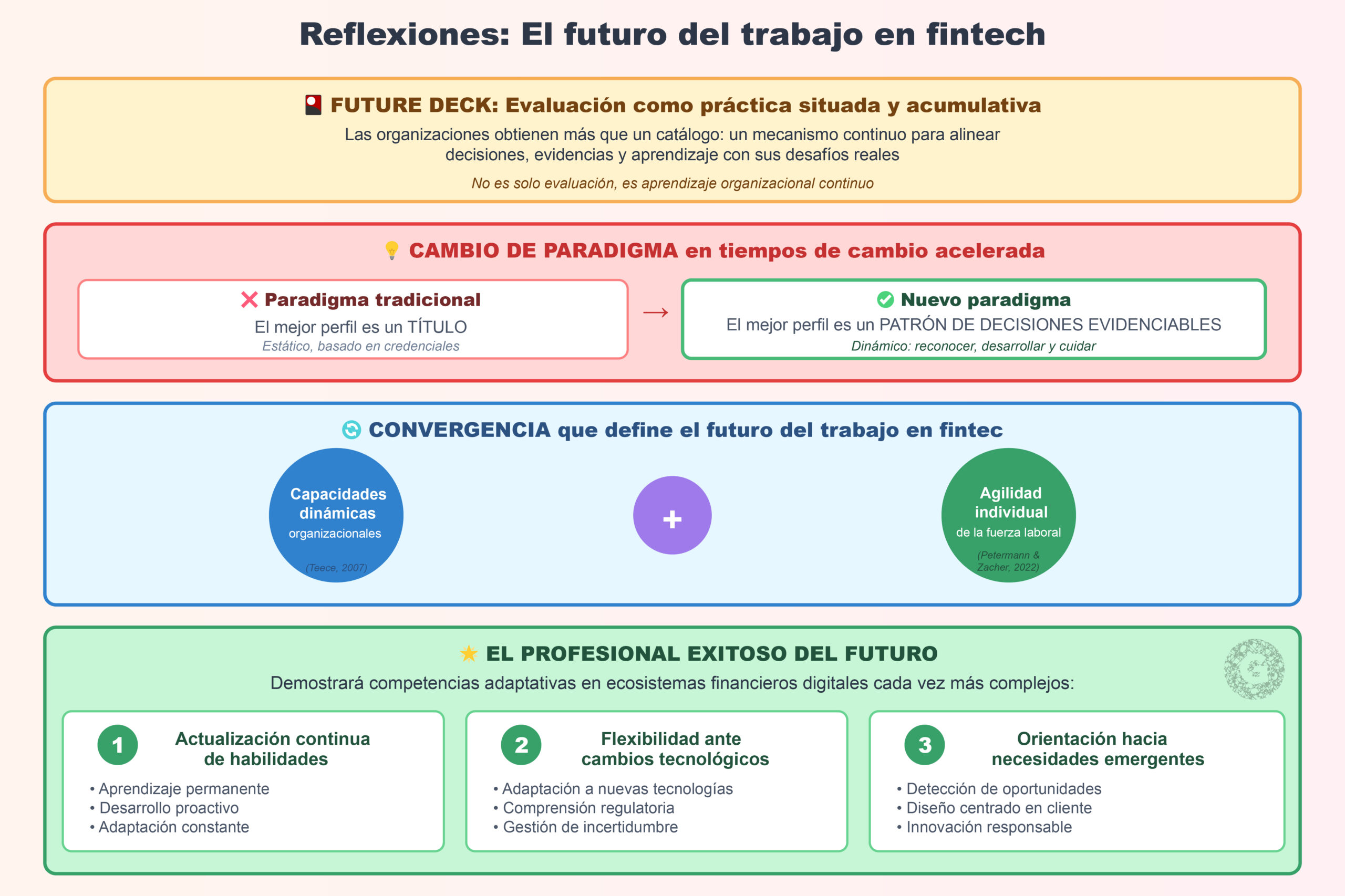 La convergencia de capacidades dinámicas organizacionales (Teece, 2007) con agilidad individual de la fuerza laboral (Petermann & Zacher, 2022) define el futuro del trabajo en fintech. Los profesionales exitosos serán aquellos que demuestren competencias adaptativas mediante actualización continua de habilidades, flexibilidad ante cambios tecnológicos y regulatorios, y orientación hacia necesidades emergentes de clientes en ecosistemas financieros digitales cada vez más complejos.