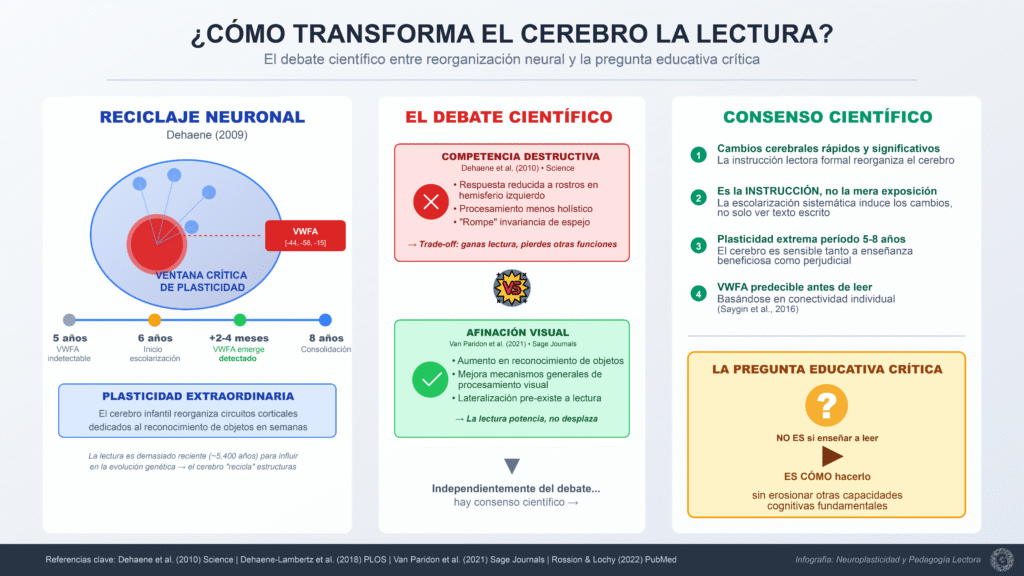 Sin embargo, evidencia reciente matiza esta visión. Van Paridon et al. (2021) estudiaron 97 participantes (alfabetizados, semi-alfabetizados, analfabetos) y encontraron que la alfabetización se asocia con aumento —no disminución— en habilidades de reconocimiento de objetos, proponiendo una hipótesis de “afinación visual” donde la lectura mejora mecanismos generales de procesamiento. La revisión crítica de Rossion y Lochy (2022) señaló que la actividad neural selectiva para rostros lateralizada al hemisferio derecho ya emerge a pocos meses de edad, mucho antes de cualquier instrucción lectora, cuestionando si la lateralización refleja competencia neural por lectura o patrones de desarrollo independientes.