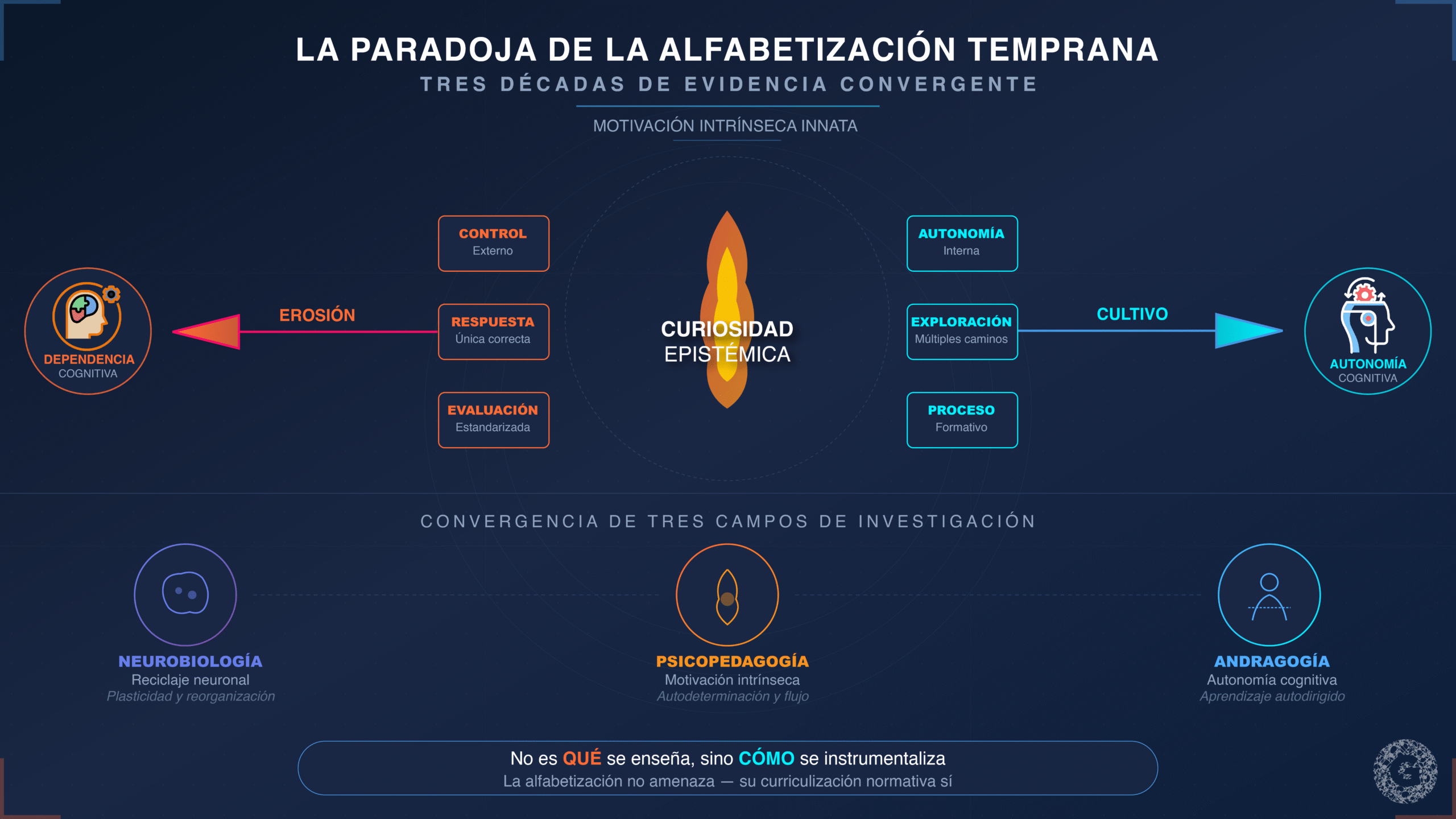 La escolarización temprana bajo currículos normativos erosiona sistemáticamente la motivación intrínseca infantil, produciendo adultos con dependencia cognitiva —no porque la lectura sea dañina, sino por cómo se enseña. La evidencia científica de las últimas tres décadas converge en un hallazgo inquietante: niños que ingresan a sistemas educativos centrados en control, respuestas correctas y evaluación estandarizada muestran declives consistentes en curiosidad epistémica, iniciativa y capacidad de autorregulación que persisten hasta la adultez universitaria. Este informe integra tres ejes de investigación —neurobiología del reciclaje neuronal, psicopedagogía de la motivación intrínseca, y andragogía de la autonomía cognitiva— para fundamentar una alerta científica: no es la alfabetización lo que amenaza el desarrollo cognitivo, sino su instrumentalización curricular.