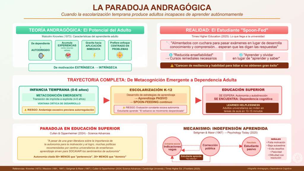 | Educación superior | Expectativa de autonomía | Dependencia cognitiva, learned helplessness |
