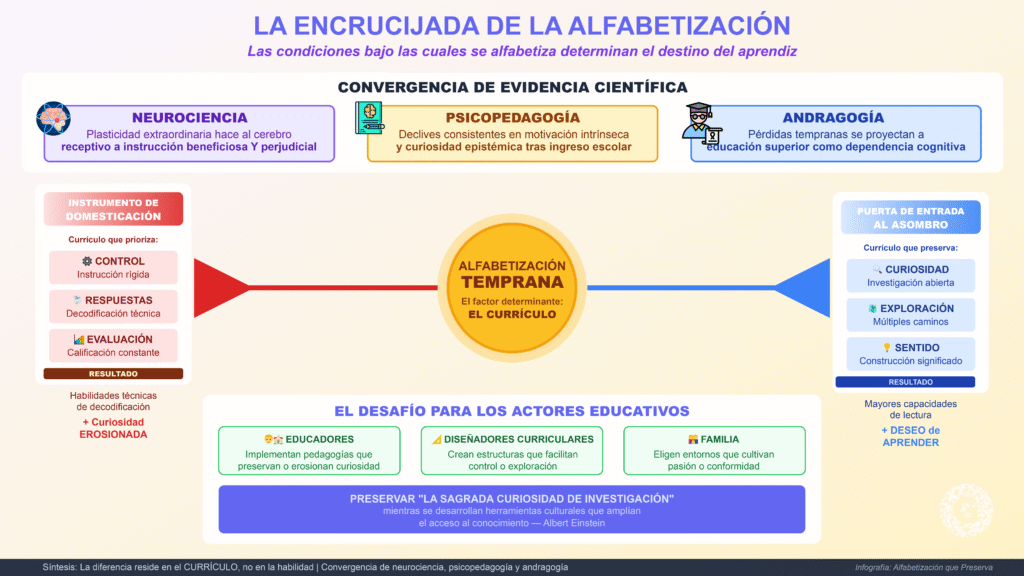 La evidencia no sugiere que aprender a leer deba evitarse o postergarse, sino que las condiciones bajo las cuales ocurre determinan si el niño emerge con mayores capacidades y deseo de aprender, o con habilidades técnicas de decodificación y una curiosidad erosionada. El desafío para educadores, diseñadores curriculares y familias es preservar lo que Einstein llamó “la sagrada curiosidad de investigación” mientras desarrollan las herramientas culturales que amplían el acceso al conocimiento. La lectura puede ser puerta de entrada al asombro o instrumento de domesticación cognitiva —la diferencia reside en el currículo, no en la habilidad.