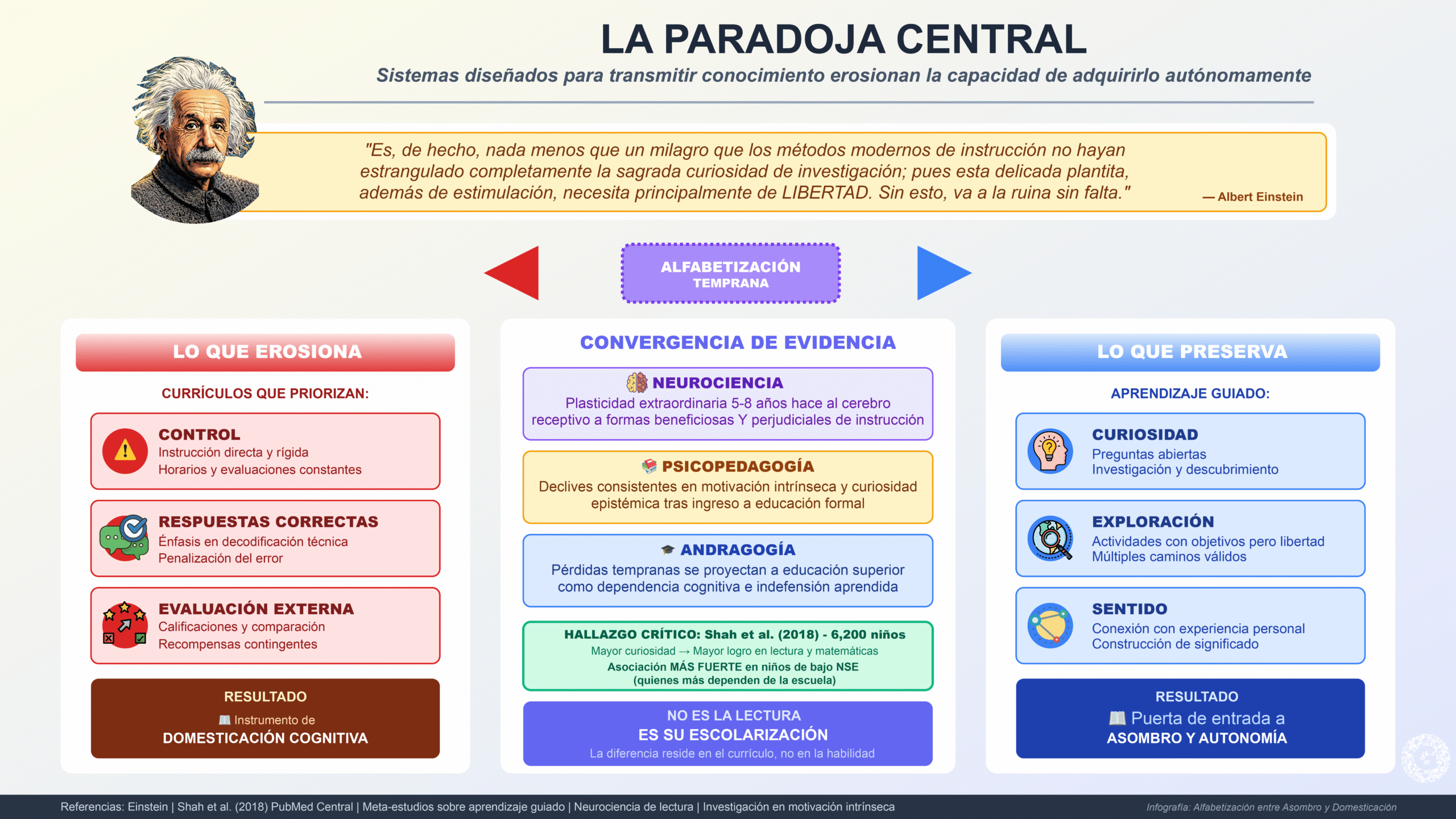 La evidencia científica converge en una paradoja inquietante: sistemas educativos diseñados para transmitir conocimiento pueden erosionar sistemáticamente la capacidad de adquirirlo autónomamente. Einstein lo articuló con precisión: “Es, de hecho, nada menos que un milagro que los métodos modernos de instrucción no hayan estrangulado completamente la sagrada curiosidad de investigación; pues esta delicada plantita, además de estimulación, necesita principalmente de libertad. Sin esto, va a la ruina sin falta.”