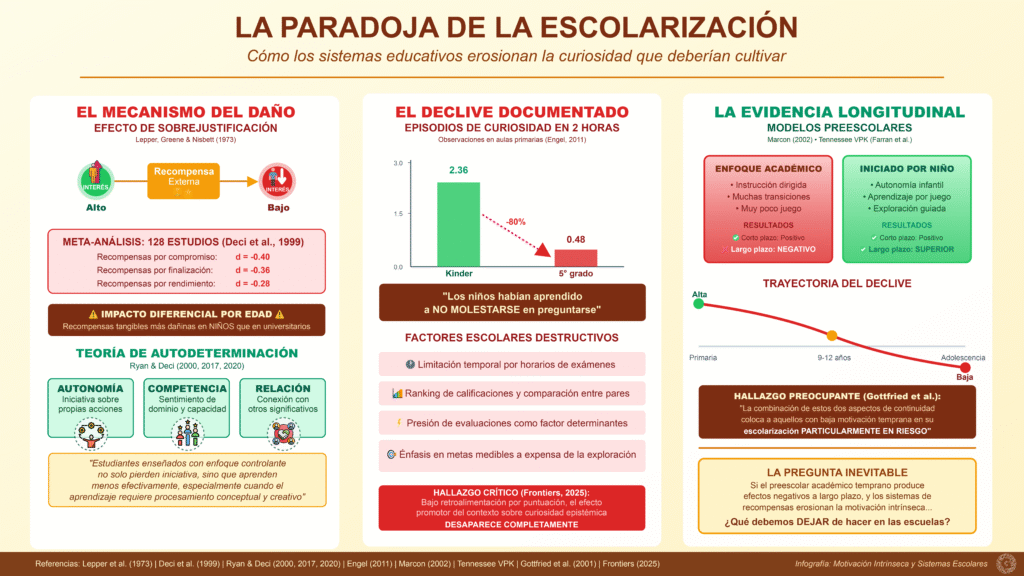 El experimento seminal de Lepper, Greene y Nisbett (1973) con niños de preescolar (40-64 meses) demostró que ofrecer recompensas extrínsecas por actividades intrínsecamente interesantes reduce el interés posterior. Este “efecto de sobrejustificación” tiene implicaciones directas para sistemas escolares que dependen de calificaciones, premios y reconocimientos como motivadores principales.