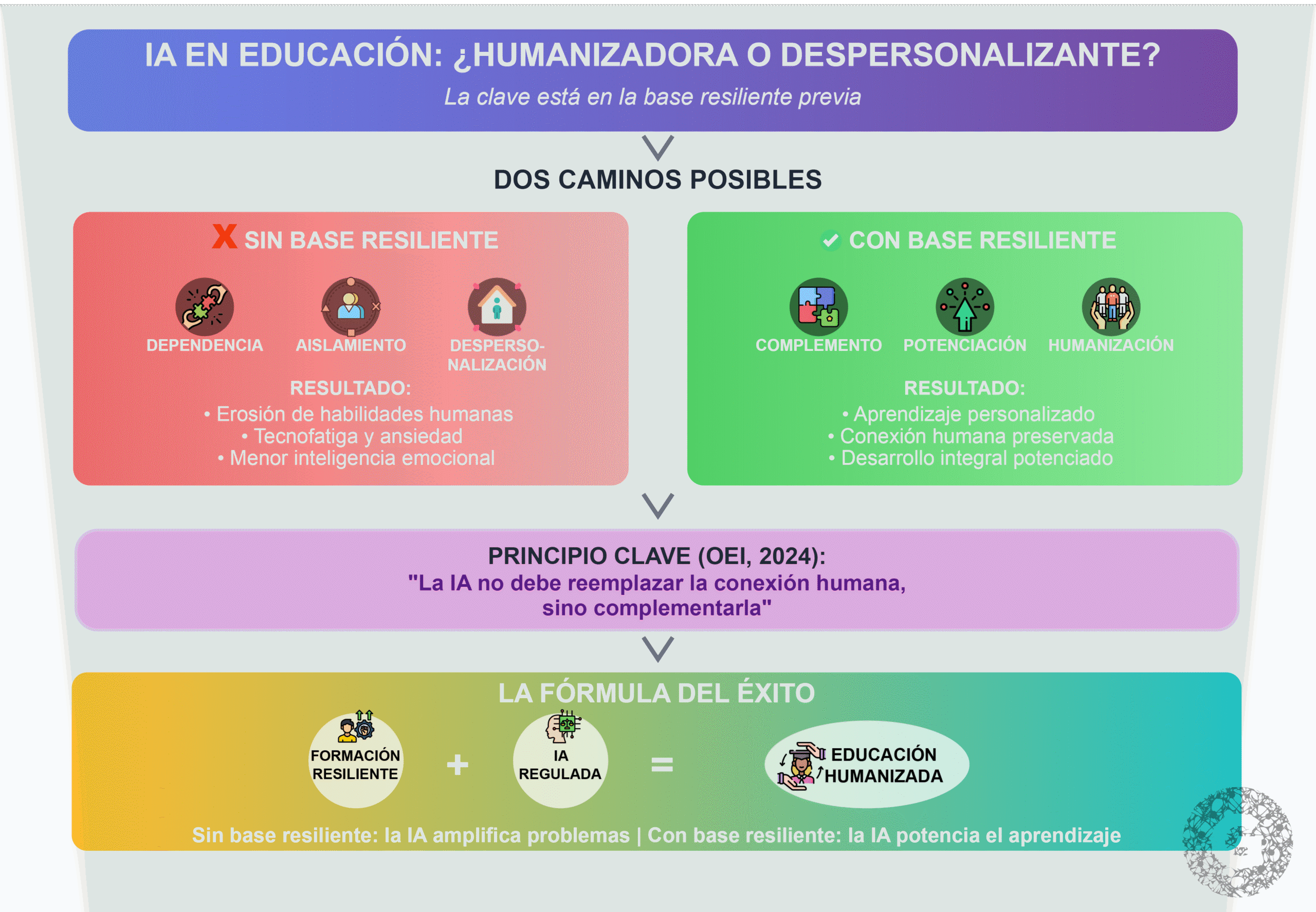 Contar con individuos resilientes y con una sólida formación socioemocional es fundamental para que la adopción de la IA en educación sea humanizadora y regulada, no despersonalizante. Sin esta base previa, existe el riesgo de que la tecnología amplifique problemas en lugar de solucionarlos. Diversos expertos advierten que una dependencia excesiva de la IA puede erosionar habilidades humanas esenciales. Por ejemplo, un mini-review reciente sobre IA y bienestar estudiantil halló que si bien la IA ofrece beneficios (personalización del aprendizaje, apoyo mental, eficiencia), la sobreutilización de IA puede mermar las competencias interpersonales y la inteligencia emocional de los estudiantes, conduciendo a mayor aislamiento social y ansiedad (Klimova & Pikhart, 2025). En entornos educativos digitalizados, delegar en exceso actividades socioemocionales a agentes artificiales (tutores virtuales, chatbots, etc.) podría generar tecnofatiga, soledad y menor contacto humano (Klimova & Pikhart, 2025). Estas evidencias respaldan la intuición de que la IA no debe reemplazar la conexión humana, sino complementarla (OEI, 2024). El Decálogo Regional en IA e IE señala expresamente: “Usa la IA como herramienta complementaria a la inteligencia humana, no como sustituto” (OEI, 2024, p. 62). Asimismo, advierte que las interacciones socioemocionales simuladas por IA, si son prolongadas o indiscriminadas, pueden llevar a desensibilización emocional y a una “falta de personalización efectiva” en el trato (OEI, 2024, p. 64). Es decir, existe un peligro de despersonalización cuando los estudiantes prefieren relacionarse con una máquina que con sus pares o docentes, lo que puede afectar su desarrollo empático y la autenticidad de sus emociones.