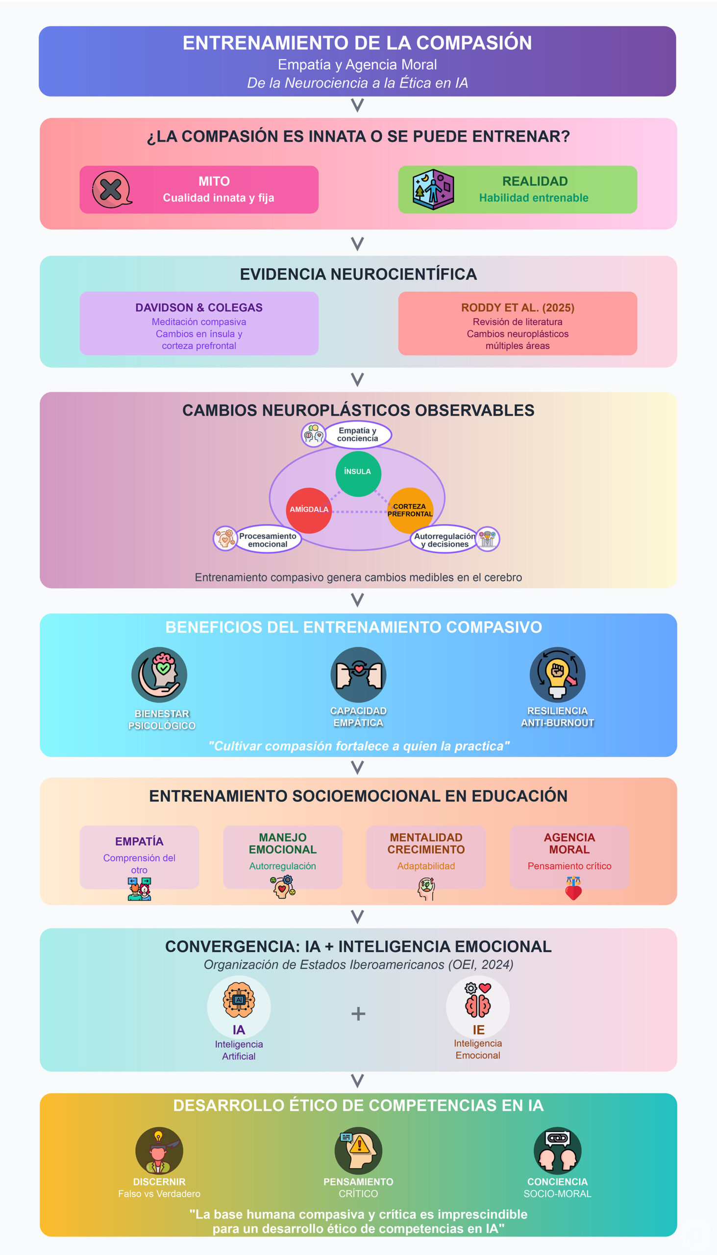 Desde la perspectiva educativa, el entrenamiento socioemocional (que engloba empatía, manejo de emociones, mentalidad de crecimiento, etc.) sienta las bases para el desarrollo de una agencia moral y crítica frente a la tecnología. La compasión entrenada amplía la conciencia ética y puede predisponer a un uso más responsable de herramientas poderosas como la IA. Alguien con alta inteligencia emocional y compasión es más propenso a cuestionar los impactos de la tecnología en los demás, a identificar sesgos o injusticias y a priorizar el bienestar humano en la toma de decisiones. De hecho, la Organización de Estados Iberoamericanos (OEI) ha subrayado la importancia de converger la inteligencia artificial con la inteligencia emocional en educación, reconociendo que para interactuar críticamente con la IA se requiere fomentar desde temprano las habilidades socioemocionales junto con las cognitivas (OEI, 2024). En su Decálogo del Diálogo Regional en IA e IE, la OEI plantea como prioridad “promover el desarrollo de la inteligencia emocional acompañada de habilidades cognitivas… para discernir entre lo falso y lo verdadero, lo correcto y lo incorrecto” al usar IA, enfatizando procesos como el pensamiento crítico, la toma de decisiones y la conciencia socio-moral (OEI, 2024, p. 63). Esto refuerza que la base humana compasiva y crítica es imprescindible para un desarrollo ético de competencias en IA.
